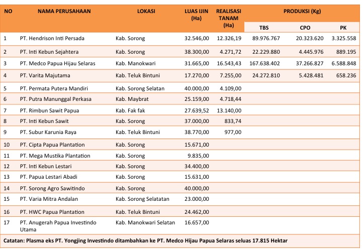 Heri Wijayanto, Kepala Bidang Perkebunan, Dinas Tanaman Pangan, Hortikultura, dan Perkebunan Papua Barat menyatakan, sampai 2019 ada 18 perusahaan sudah mendapat izin usaha perkebunan (IUP) di Papua Barat dengan luas 490.191 hektar.