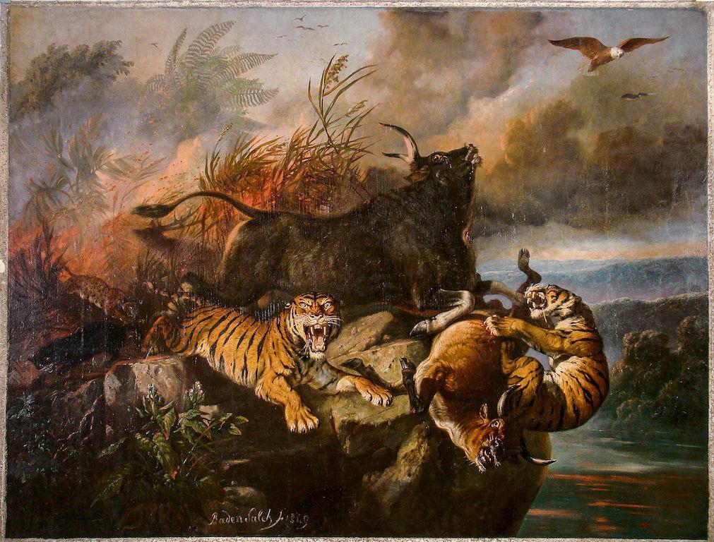 Sejauh ini hanya lukisan Raden Saleh yang masih “bercerita” tentang macan loreng. Semisal, lukisan Kebakaran Padang Rumput tahun 1849. Pada lukisan 300 x 398 cm, Raden Saleh sengaja membikin orang marah dengan tragedi kebakaran yang mengepung satwa hingga ujung jurang.