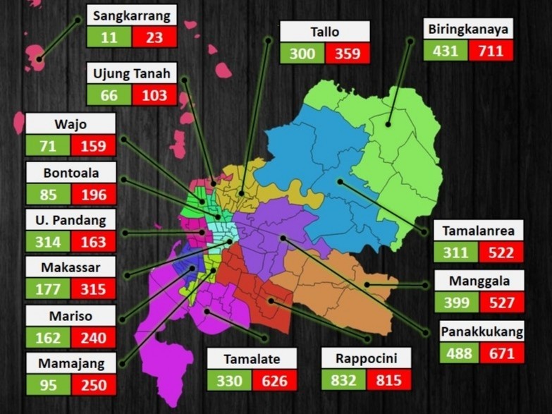 Khusus untuk Kecamatan Sangkarrang, tidak ada kasus baru setelah bulan Juli 2020. Hingga Juli, tercatat 24 kasus kemudian mentok. Bandingkan dengan Rappocini pada bulan yang sama mencapai 800 kasus, lalu terus bertambah di bulan Agustus 2020.