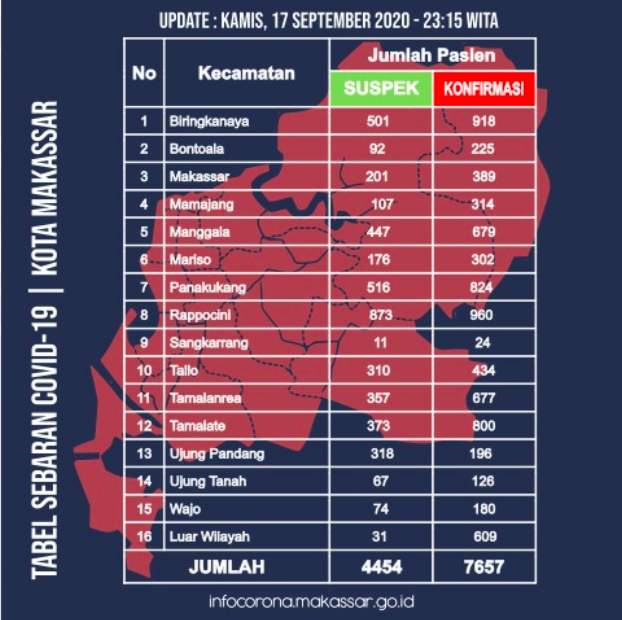 Laporan Tim Percepatan Penanggulangan COVID-19 Makassar menyebutkan bahwa Kecamatan Sangkarrang ‘hanya’ 24 orang terpapar virus ini atau paling sedikit dari limabelas kecamatan di Kota Makassar. Bandingkan seperti Kecamatan Rappocini yang mencapai 960 orang positif hingga 17 September 2020.
