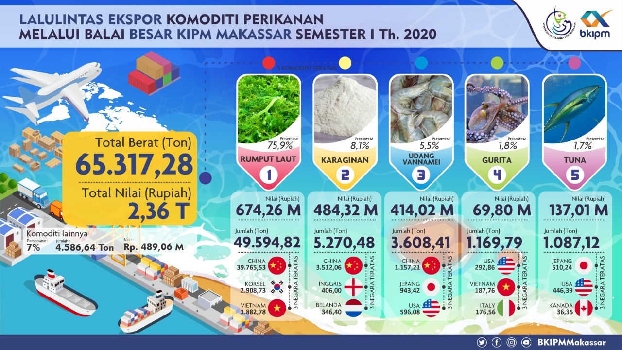 Sementara itu, laporan lalulintas perikanan ekspor dari Kota Makassar semester I tahun 2019 oleh Balai Besar Karantina Ikan, Pengendalian Mutu dan Keamanan Hasil Perikanan (BKIPM) Makassar menyebutkan total komoditi perikanan mencapai 44.039 ton dengan total nilai komoditi mencapai Rp2,4 triliun.