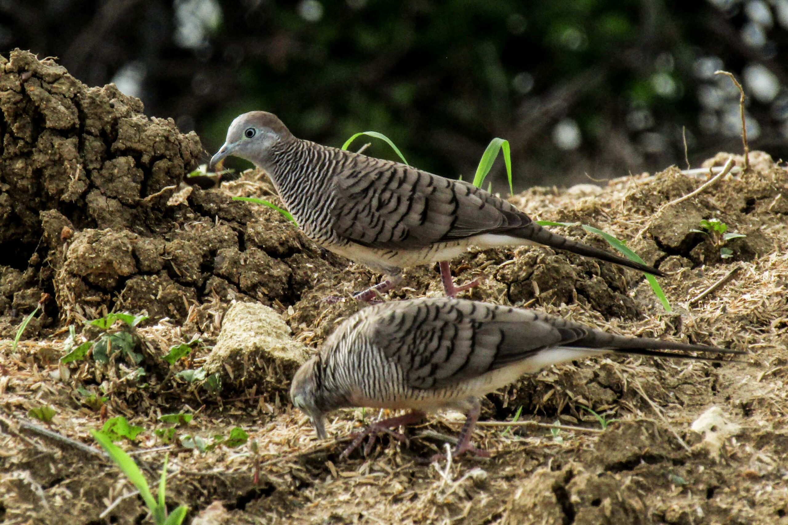 Paruh hitamnya mematuk makanan di tanah, langkahnya sama beriringan ketika mencari biji-bijian yang merupakan makanannya. Tak berselang lama sepasang burung ini terbang dan bertengger di atas tumpukan kayu.