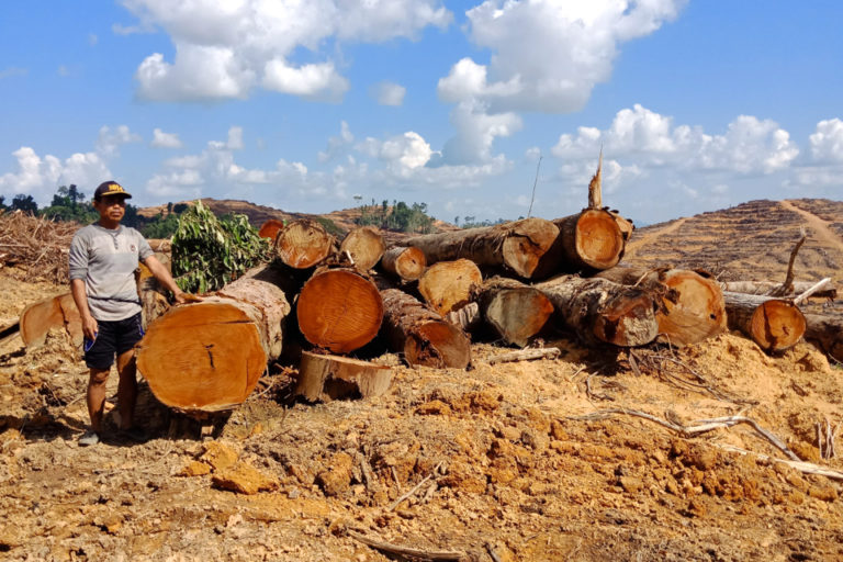 Keterangan foto utama: Hutan adat Laman Kinipan yang bertumpang tindih dengan konsesi perusahaan sawit. Perusahaan mulai menebang pepohonan hutan pada 2018. Foto: warga Kinipan