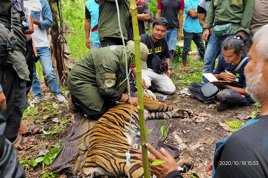 - Saat ditemukan, 18 Oktober 2020, harimau betina tersebut tergeletak lemah. Jerat berupa kumparan kawat telah menggulung leher, dada, dan punggungnya.