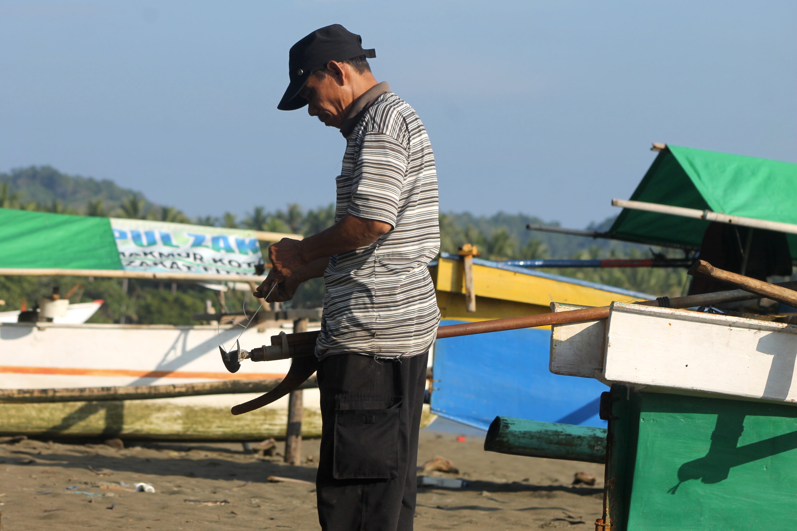 Kalau cuaca buruk, kadang tidak membawa hasil dari melaut. “Penjualan tergantung yang kami para nelayan dapat. Kalau banyak biasanya harga turun, tapi kalau sedikit didapat harga naik,” katanya sambil memperbaiki mesin perahunya.