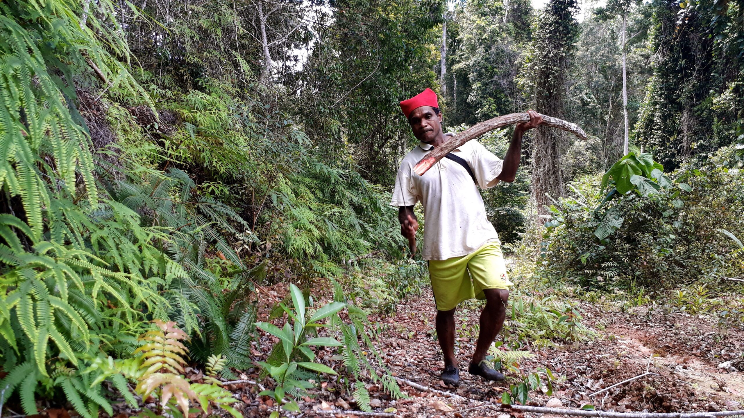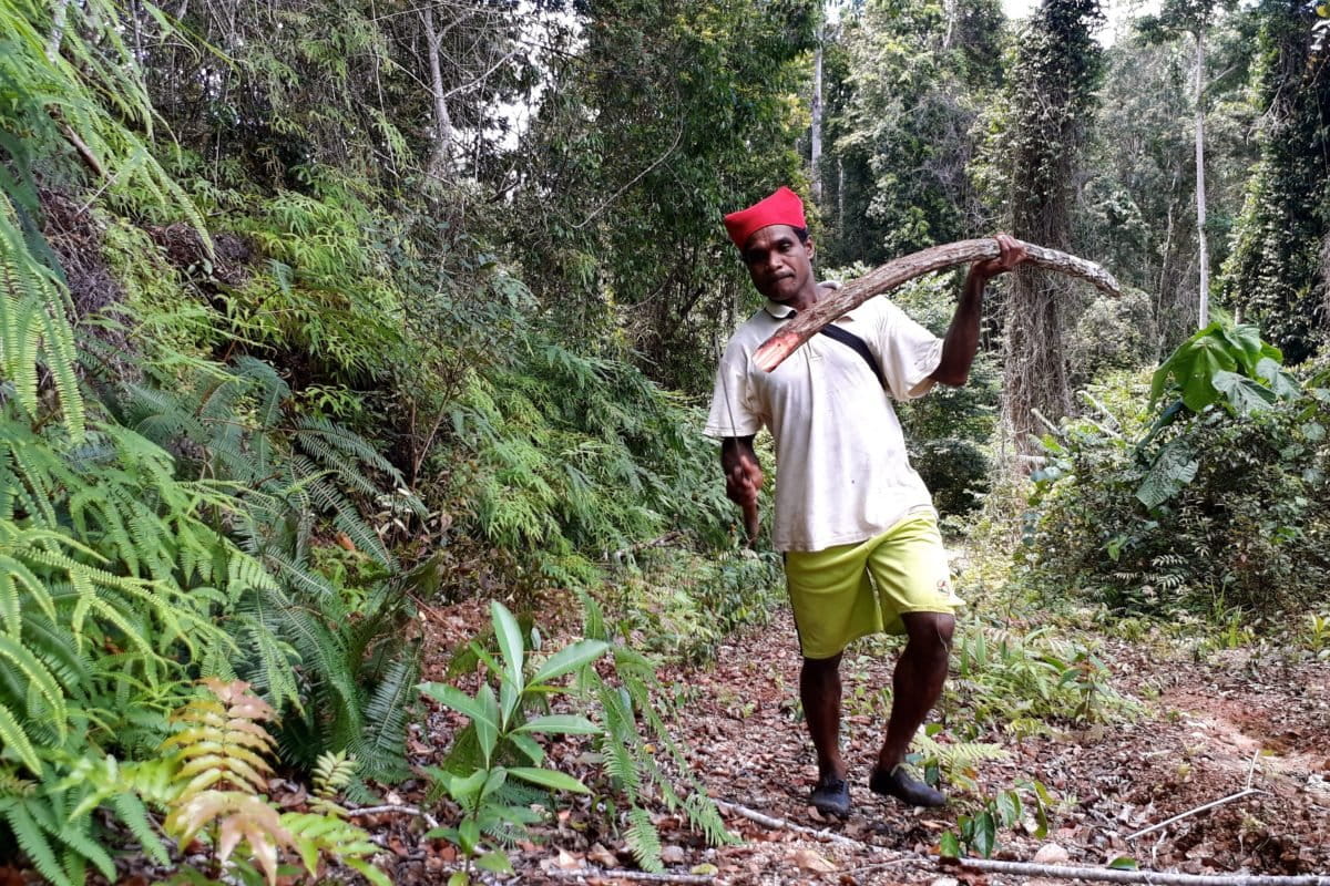 Foto utama: Manus Leipary beristirahat di bawah pohon besar di hutan. Foto: M. Jaya Barends.