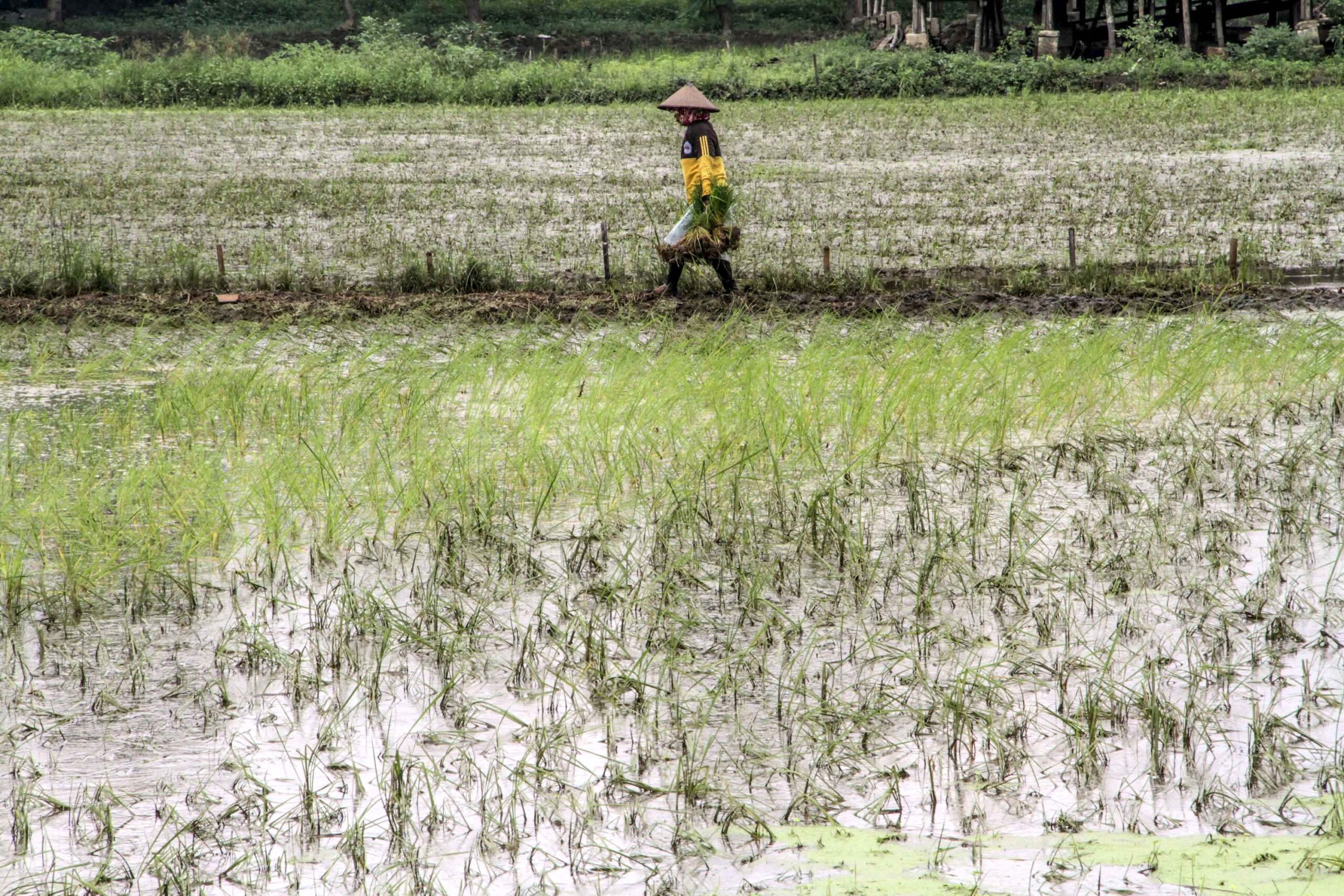 Banjir yang terjadi selama sepekan di kabupaten dengan jumlah 18 kecamatan ini selain merendam barang-barang berharga miliknya juga merendam tanaman padi yang baru ia tanam. Akibatnya tanaman padi itu amblas diterjang banjir.