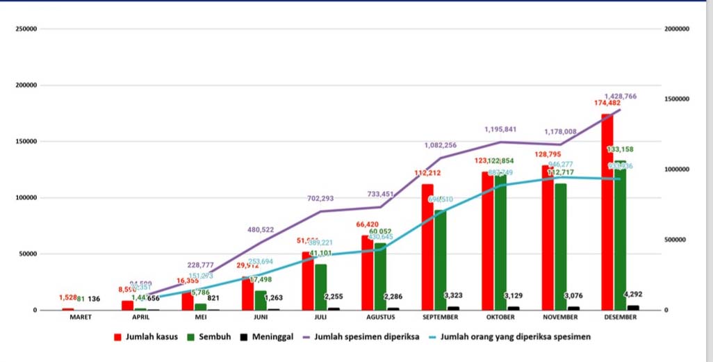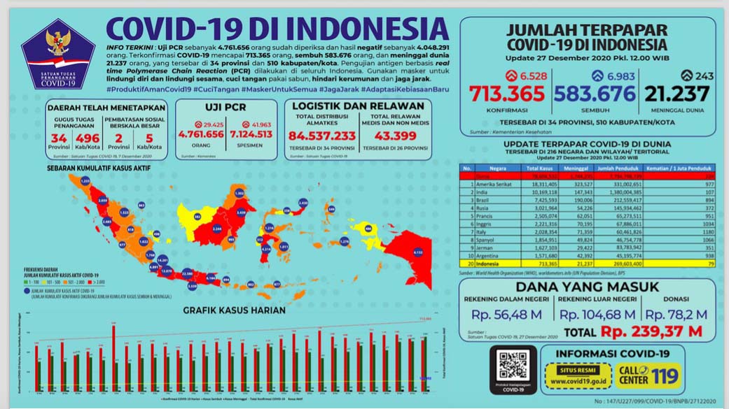 Tahun 2020, hampir berlalu, tetapi kondisi pandemi Coronavirus Disease (COVID-19) di Indonesia, makin memburuk. Sementara vaksin belum ada kejelasan. Korban meninggal dunia, sudah tembus 200 orang per hari. Satuan Tugas Penanganan COVID-19 sampai 27 Desember 2020 melaporkan 713.365 orang positif, tambah 6.282 orang dan meninggal dunia total 21.237 jiwa, atau ada tambahan 243 orang.