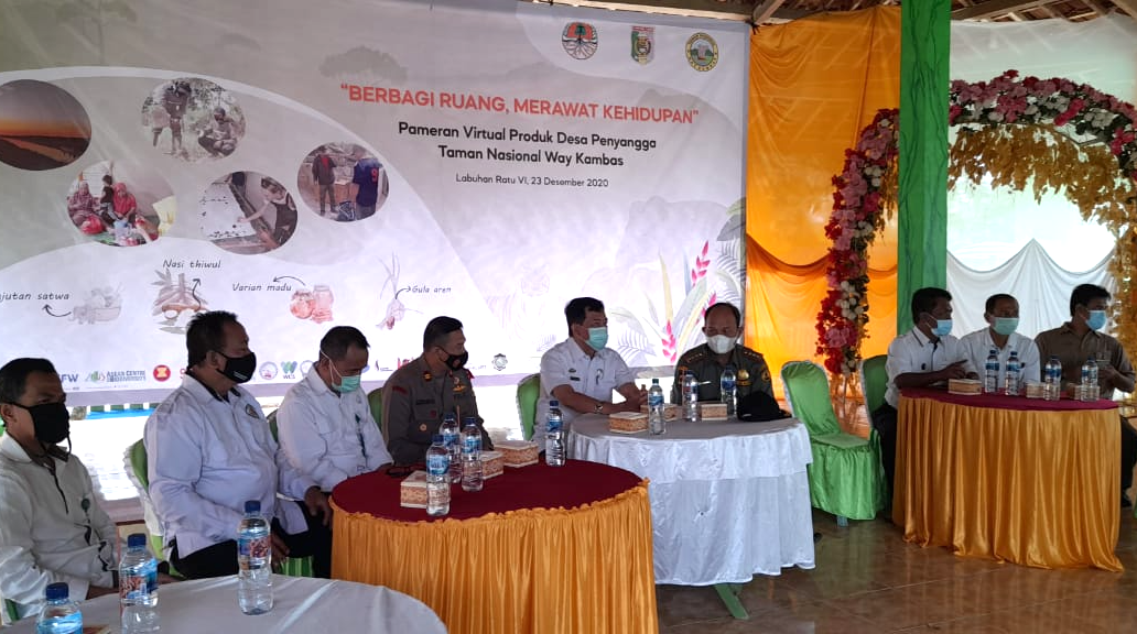 - Wujud berbagi ruang dengan satwa dari sisi pemanfaaatan dan pelestarian itu tercermin dalam kegiatan Pameran Virtual Produk Masyarakat Desa Penyangga, pada Rabu (23/12/2020) bertema “Berbagi Ruang, Hidup Berdamping, Merawat Kehidupan” yang diselenggarakan Balai TNWK, Pemerintah Propinsi Lampung dan kabupaten dengan mitra TNWK