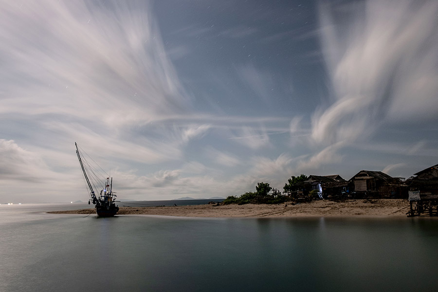 Setelah menikmati cumi dan ikan kerapu bakar, kami memutuskan istirahat. Seiring berhentinya suara mesin genset warga, suasana Pulau Semujur seketika sunyi, hanya menyisakan lampu kapal nelayan.