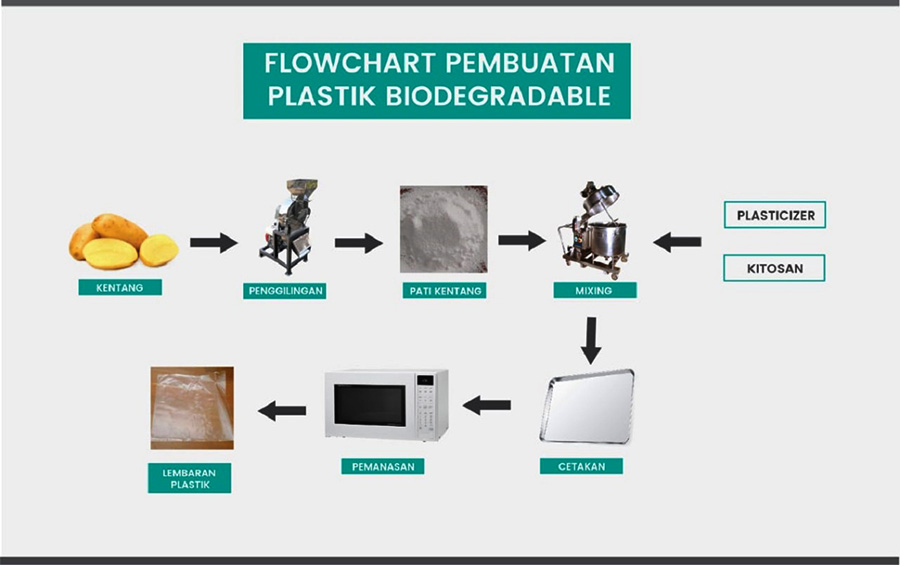 - Memanfaatkan kentang yang tidak lolos sortir untuk dijual di pasar, kentang tersebut digiling halus untuk diambil sari patinya. Lalu diolah dan dicampur plastisizer dan kitosan, dan dicetak pada cetakan lembaran.