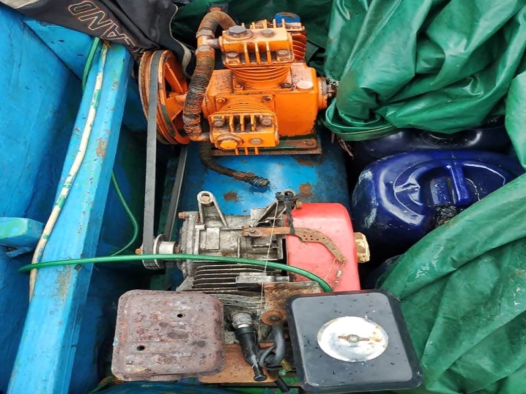 Di dalam perahu ditemukan satu unit kompresor merk Mustang, satu set slang dan dakor, ikan karang berbagai jenis seberat 20 kg serta dua buah kaca mata selam.