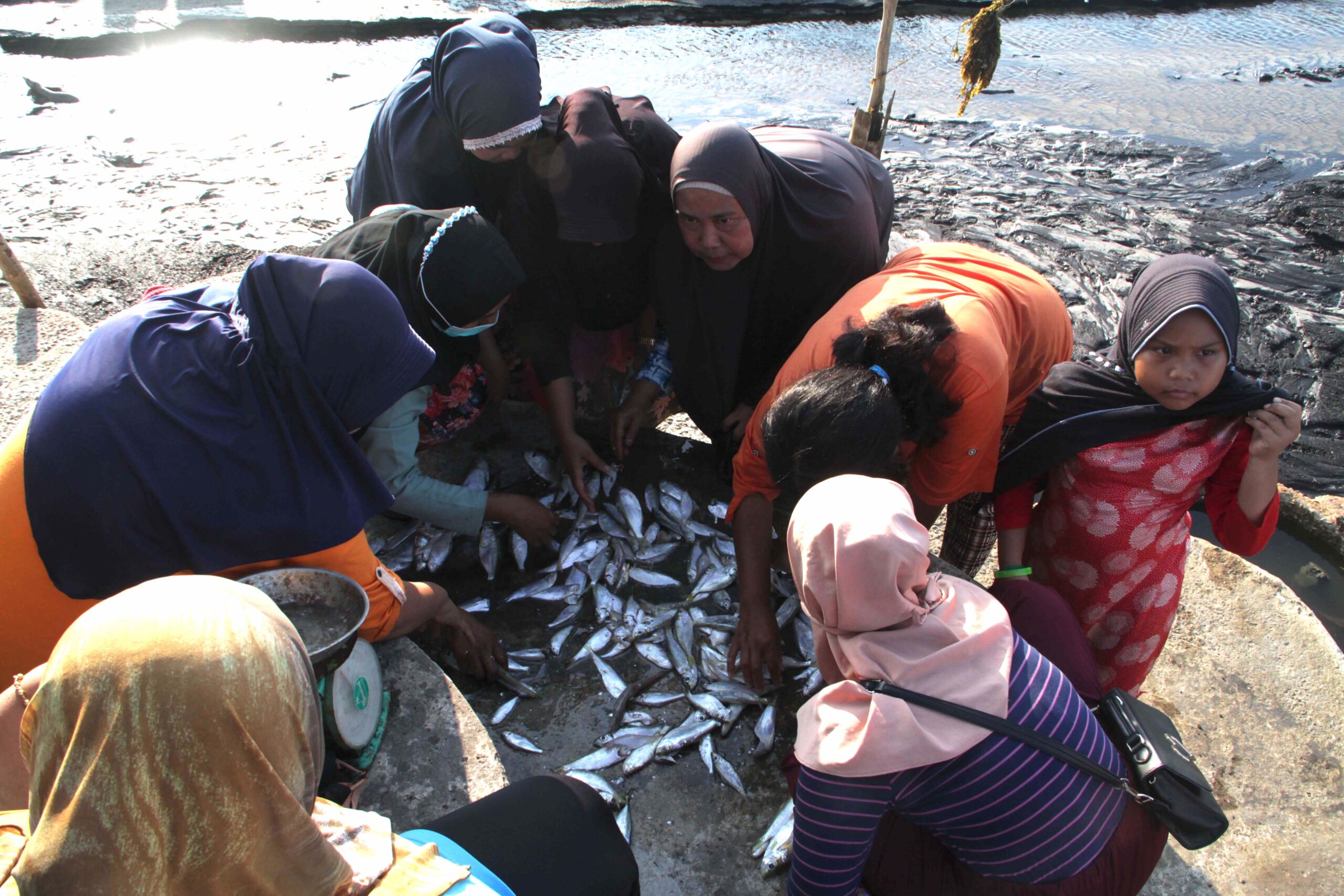 Sampai-sampai sebagian pembeli ini ada yang rela berjalan kaki menuju ke tempat perahu-perahu nelayan berlabuh, jaraknya kurang lebih 50 meter dari daratan. Mereka kemudian melakukan transaksi di laut meski dengan kondisi air masih selutut. Di tempat berlabuh perahu tersebut selain pembeli, ada juga keluarga nelayan yang berdatangan.