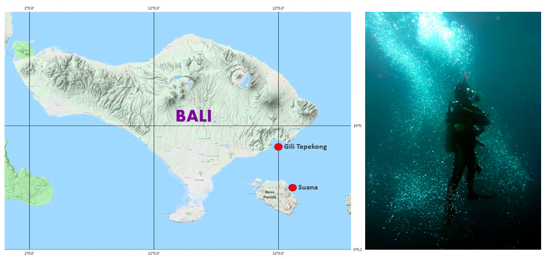 Secara geografis Pulau Bali diapit dua selat, yaitu selat Bali yang menghubungkan Pulau Bali dan Pulau Jawa di sisi barat dan Selat Lombok yang menghubungkan Pulau bali dan Pulau Lombok di sisi timur. Sebagai pulau destinasi wisata, Bali memiliki objek wisata bahari yang menghadap kedua selat tersebut, secara khusus wisata selam.
