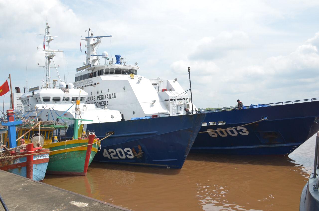 Lima kapal asing berbendera Vietnam itu bersandar di dermaga Pengawasan Sumber Daya Kelautan dan Perikanan Pontianak, Kalimantan Barat, Senin (13/4/2021). Kelima kapal beserta 28 Awak Buah Kapal (ABK) menjadi tahanan negara. Kapal-kapal ini kedapatan melakukan penangkapan tanpa izin diperairan Indonesia, pada Jumat pekan lalu.