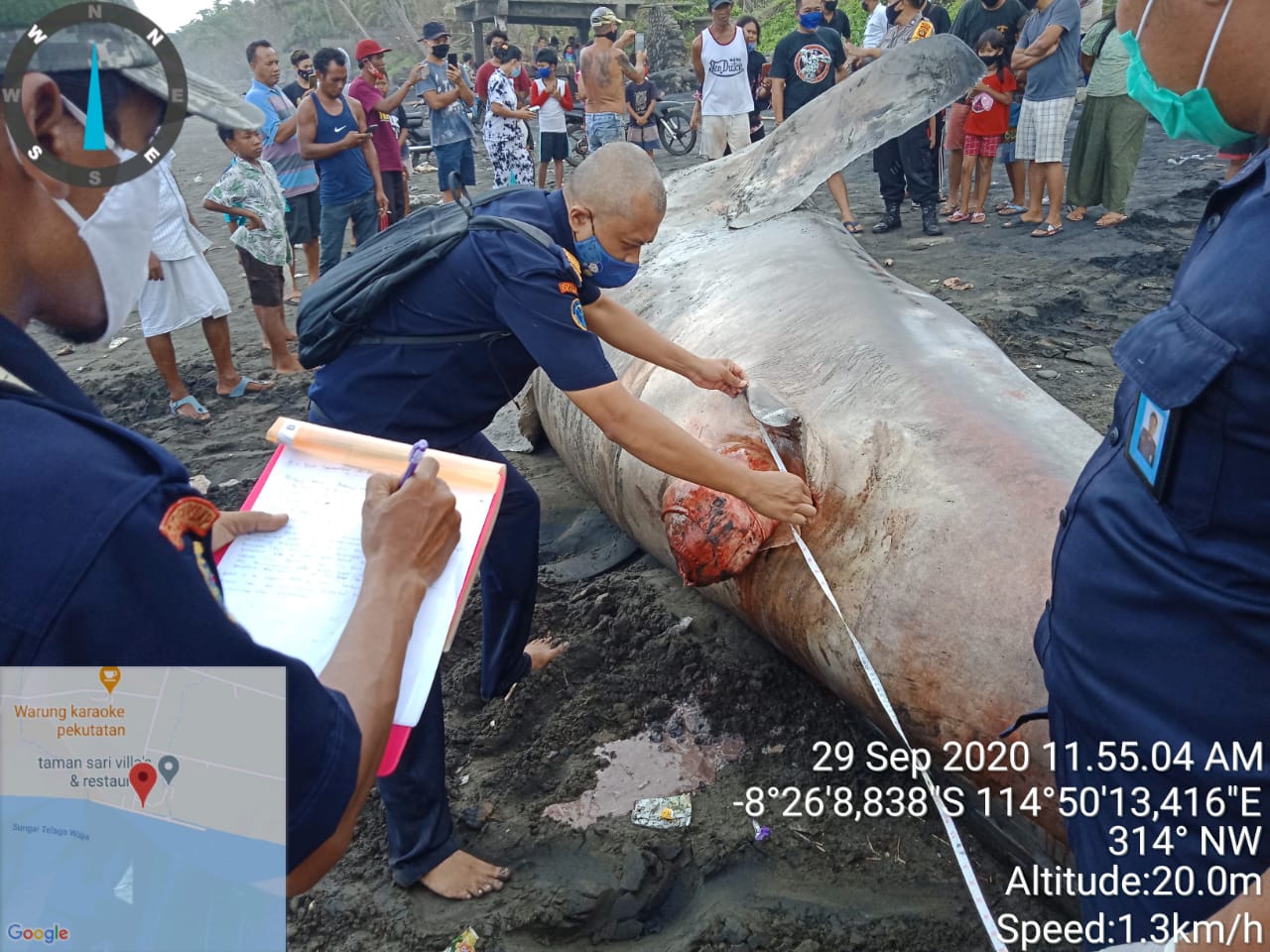 Warga melaporkan peristiwa terdampar ini ke Satpas Polair, lalu mengecek ke lokasi. Kondisi awal lokasi penemuan pada koordinat 8°23’45.7″LS dan 114°43’50,2″BT, kondisi pantai surut, cuaca cerah panas.