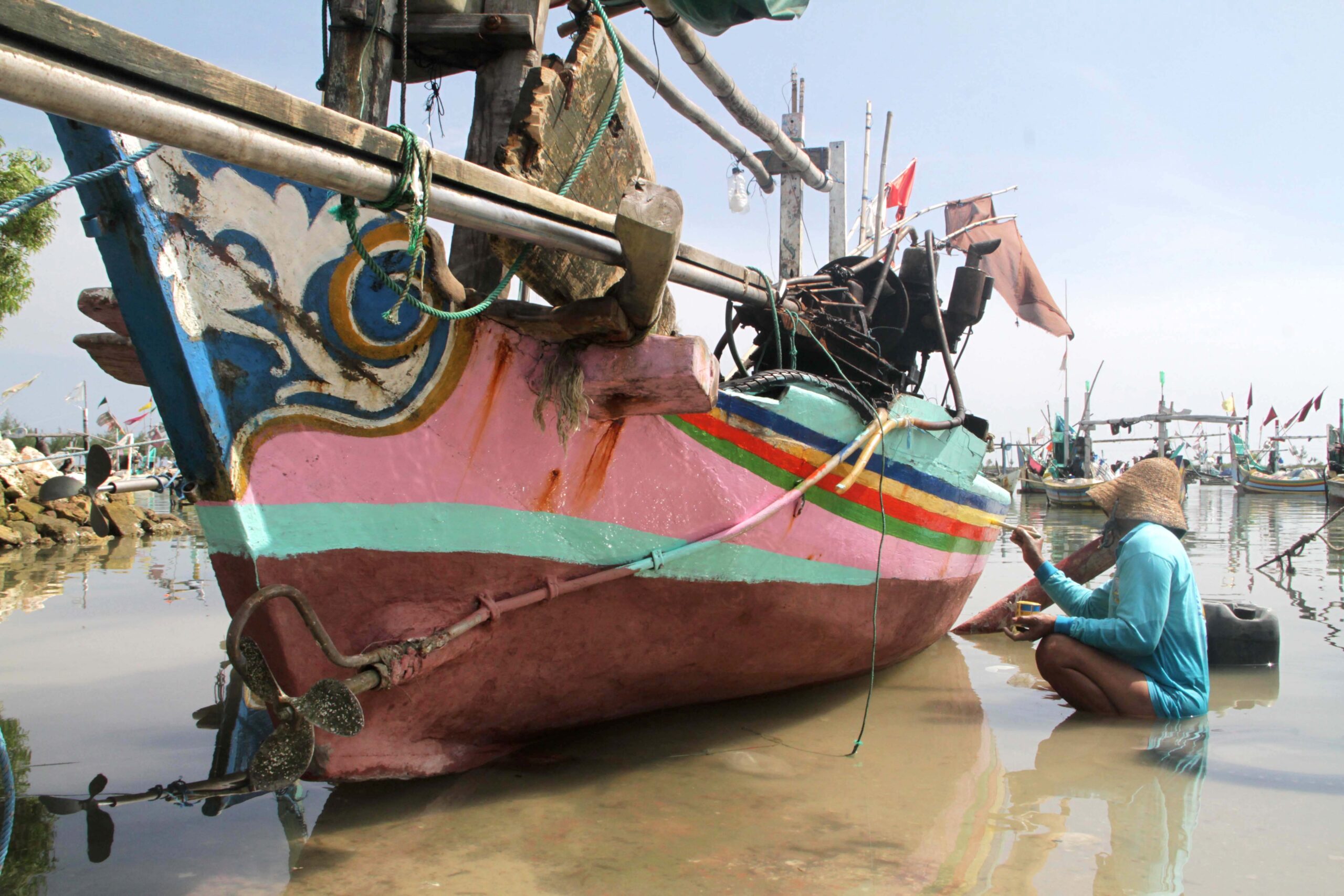 Antara perahu satu sama lain berjarak, sehingga beruntung tidak membuat perahu-perahu ini benturan. Para nelayan setempat biasa menggunakan perahu ini untuk mencari hasil tangkapan di perairan laut Jawa. Suasana tampak sepi, hanya ada dua orang terlihat tengah memperbaiki jaringnya yang rusak.