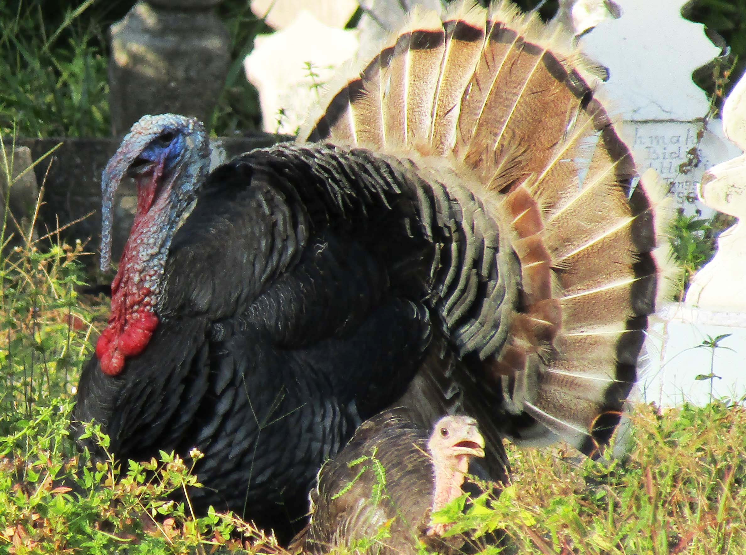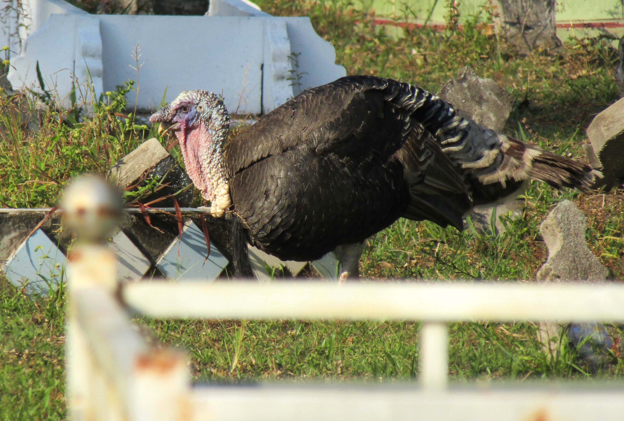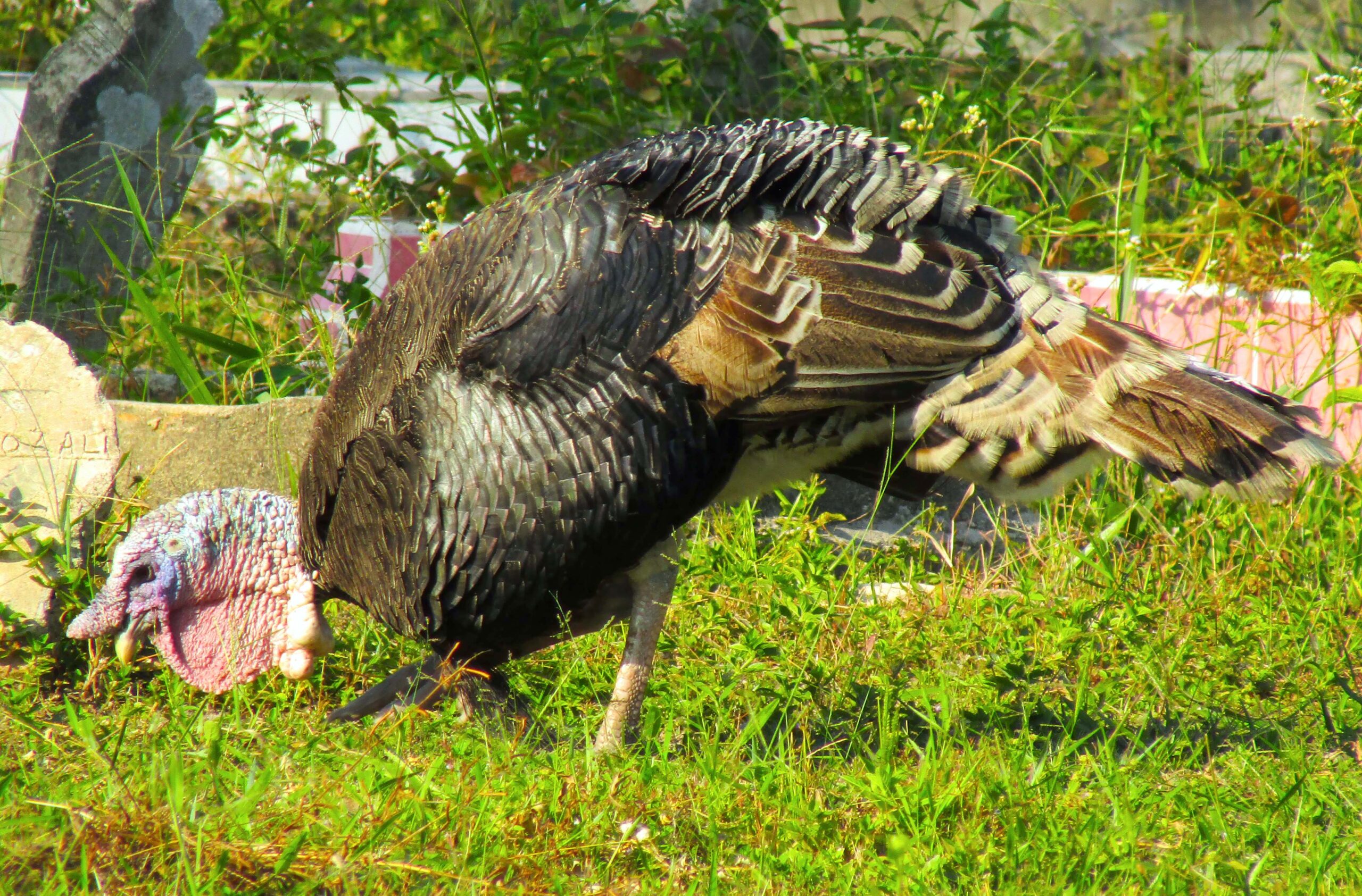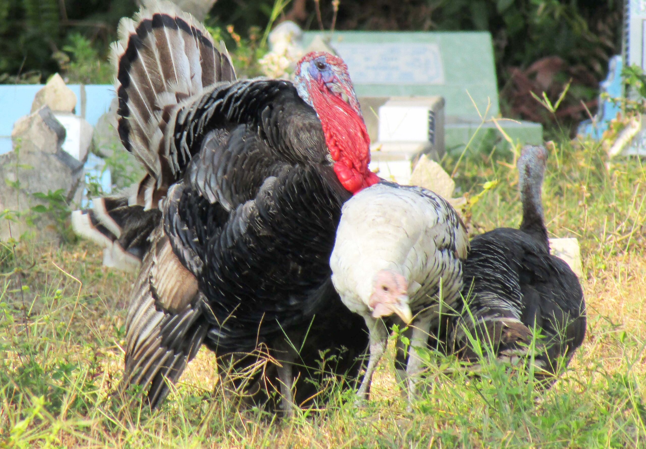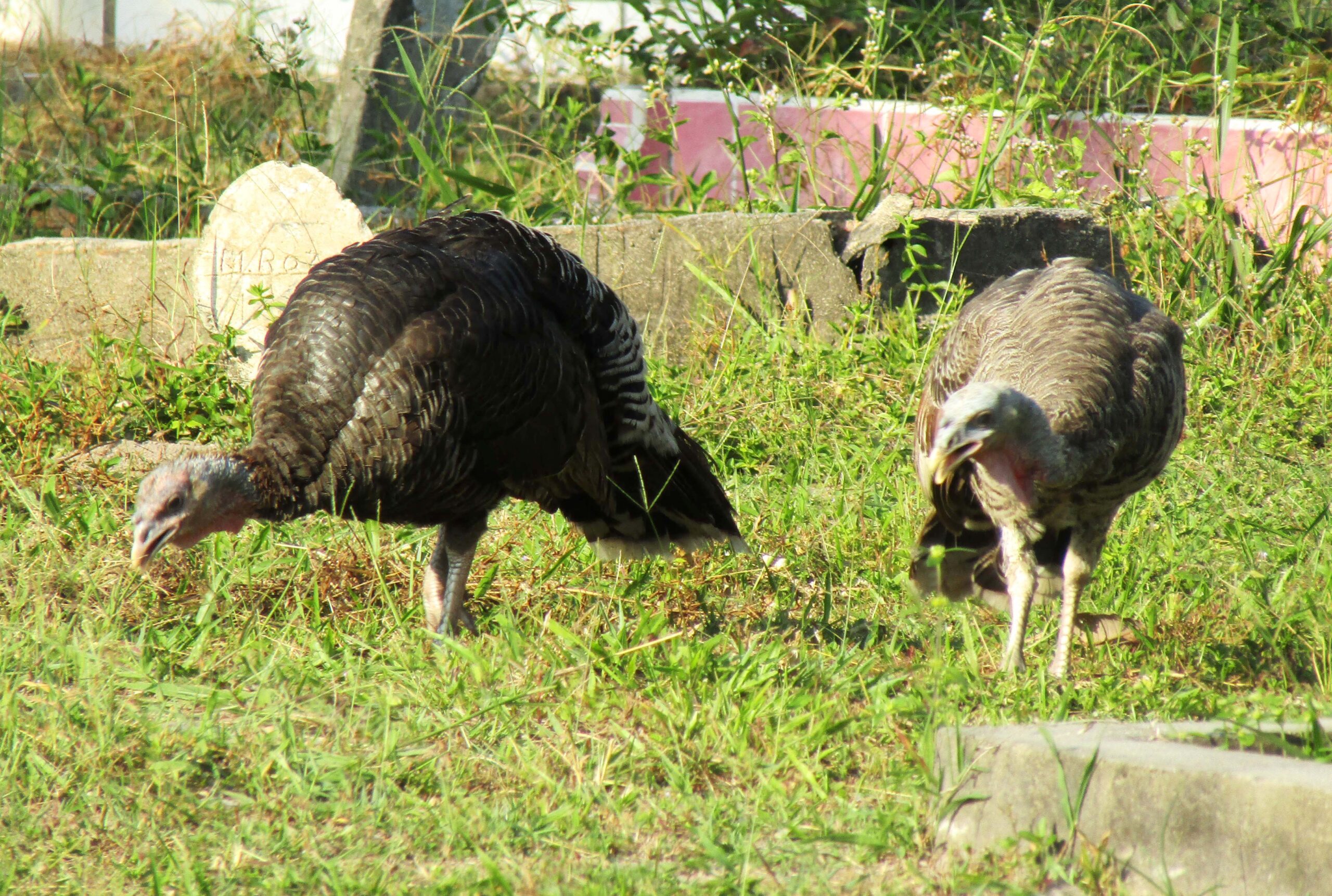 Tiga ekor unggas berukuran besar tengah mematuk-matuk mencari makan di kawasan kuburan. Satu diantaranya memiliki ukuran lebih besar dan warna bulunya lebih berwarna-warni Saat berjalan kadang terpisah, tapi lebih seringnya bergerombol lagi. Mereka adalah ayam kalkun (Meleagris), merupakan spesies burung berukuran besar dari ordo Galliformes genus Meleagris.