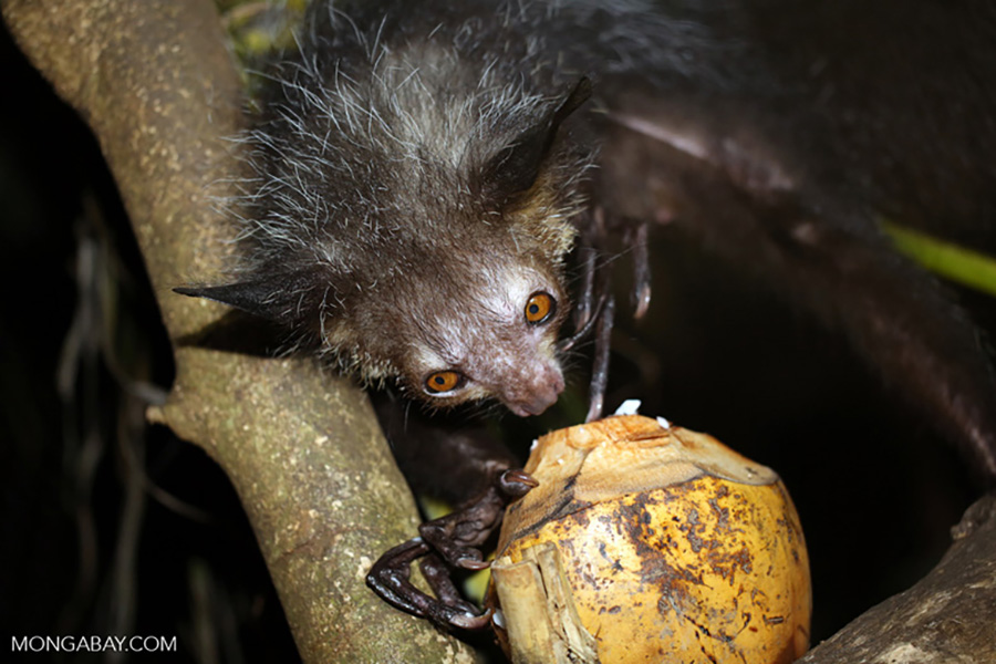 Telinganya yang lebar seperti kelelawar, membantu aye-aye menemukan makanan. Organ sensitif ini dapat mendeteksi area berlubang di pohon melalui gema yang dibuat saat mengetuk kayu.