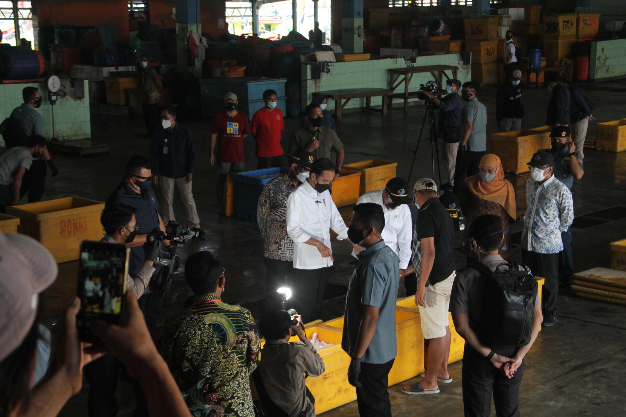 Sebelum berdialog, Presiden ke-7 Indonesia ini terlebih dahulu meninjau ikan hasil tangkapan nelayan yang dipamerkan di lapak-lapak para pedagang. Dengan didampingi Menteri Kelautan dan Perikanan (KKP), Sakti Wahyu Trenggono, Gubernur Jawa Timur, Khofifah Indar Parawansah dan Bupati Lamongan, Yuhronur Efendi, Jokowi mendatangi satu persatu para pedagang ikan yang ada di area Pusat Pemasaran dan Distribusi Ikan (PPDI) tersebut.