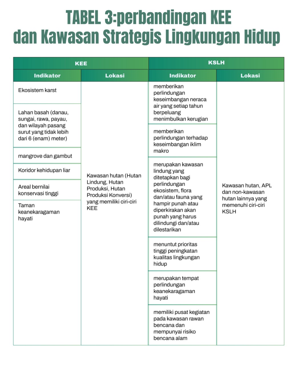 Secara yuridis-normatif terutama mengacu ke PP No.28/2011 jo PP No.108/2015, ruang lingkup KSLH tidak berbeda bahkan sama dengan usulan KEE. Perbandingannya dapat dilihat dalam tabel 3. Perbedaan utamanya terletak pada lokasi yang diajukan. Minimnya landasan hukum, mengarahkan rujukan definisi KEE satu-satunya yang relatif lengkap pada penjelasan Pasal No. 24 PP 28/2011. Disitu disebutkan, KEE merupakan kelanjutan KSA/KPA di luar kawasan konservasi dan merupakan bagian dari kawasan hutan yang pengaturannya terkait dengan perlindungan hutan. Sementara KSLH, seperti diutarakan di atas bisa dalam kawasan hutan maupun luar kawasan hutan.