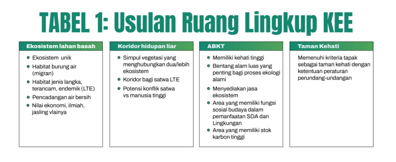 Direktorat Bina Pengelolaan Ekosistem Esensial (BPEE) Konservasi Sumberdaya Alam dan Ekosistem (KSDAE) Kementerian Lingkungan Hidup dan Kehutanan (KLHK) mengajukan sejumlah kriteria wilayah yang dapat diusulkan sebagai KEE, yakni mencakup empat kategori berupa ekosistem lahan basah, koridor hidupan liar/satwa, ABKT (Areal Bernilai Konservasi Tinggi), dan taman kehati (keanekaragaman hayati). Seperti dipaparkan pada tabel 1 berikut ini, masing-masing kategori ini mempunyai penjabaran ruang lingkup masing-masing.