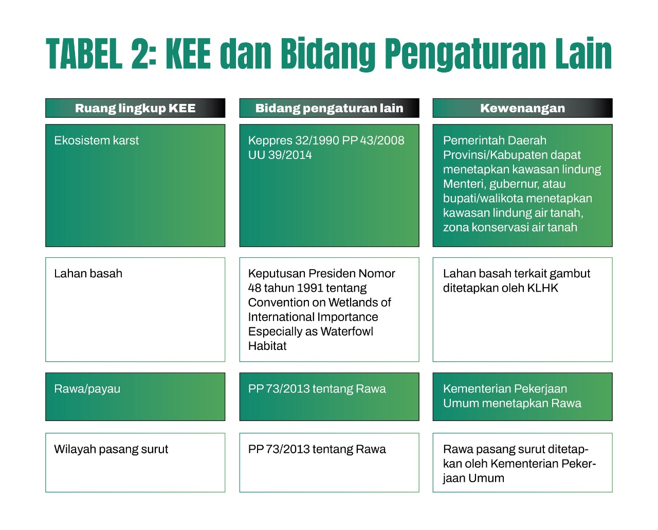 Kedua, definisi sekaligus ruang lingkup KEE mencakup ekosistem karst, lahan basah (danau, sungai, rawa, payau, dan wilayah pasang surut yang tidak lebih dari enam meter). Dalam kenyataannya, definisi ini terkait dengan beberapa peraturan perundang-undangan lainnya dengan kewenangannya yang sudah terbagi. Otoritasnya tidak hanya ada pada instansi yang menggawangi konservasi, tetapi tersebar ke bidang-bidang lain, seperti nampak dalam tabel 2 berikut ini.