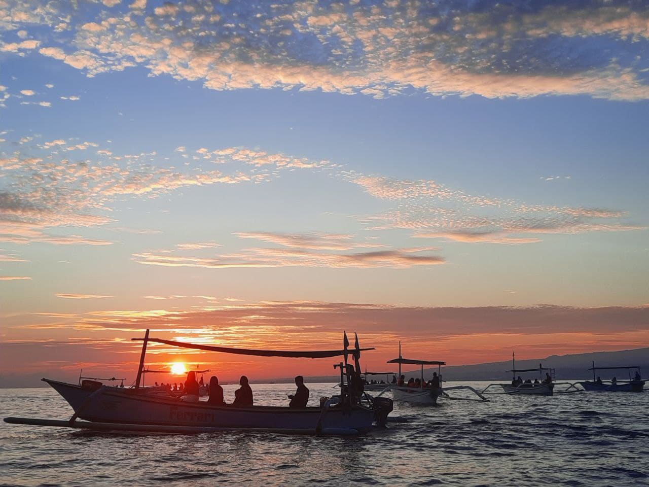 Perahu-perahu lain pun bermunculan di radius sekitar 500 meter ini, saat dihitung sedikitnya ada 30 kapal yang sedang menikmati matahari terbit di tengah laut. Indah dan menghangatkan. Laut Lovina terkenal tenang, demikian juga hari ini. Angin membelai kulit, walau mesin perahu mati, tak terasa terombang-ambing gelombang.