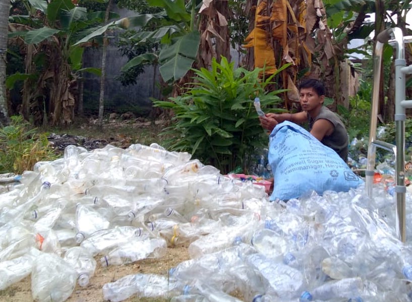 Dengan keterbatasan fisiknya Ali Topan masih terlibat dalam pemilahan sampah plastik. Foto: Ali Topan