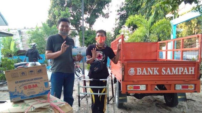 Ali Topan (yang menggunakan alat bantu jalan) sukses mengembangkan bank sampah dan membantu masyarakat miskin melalui ‘sedekah sampah’. Ia menjadi inspirasi pemuda di daerahnya dan daerah lain. Foto: Ali Topan