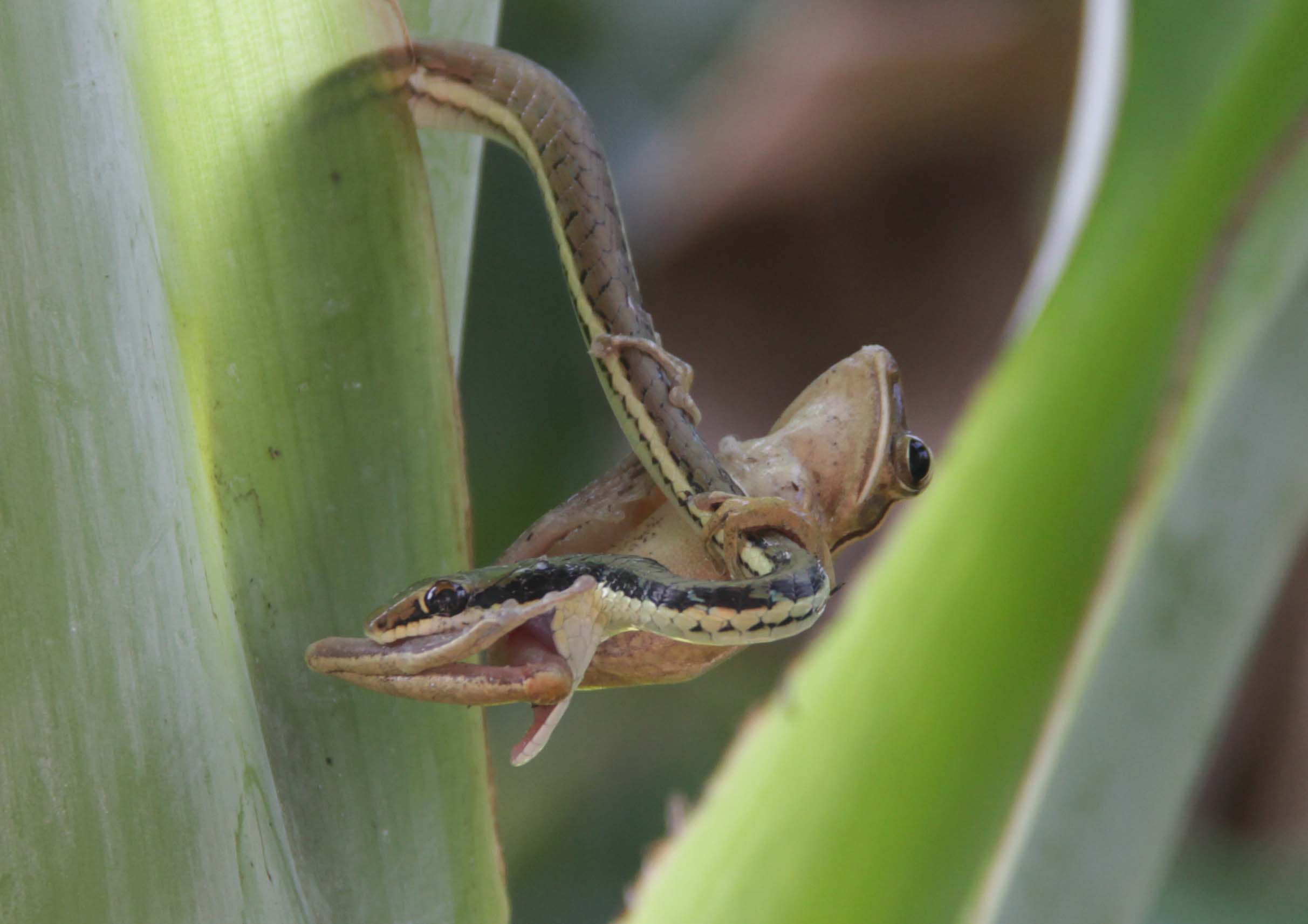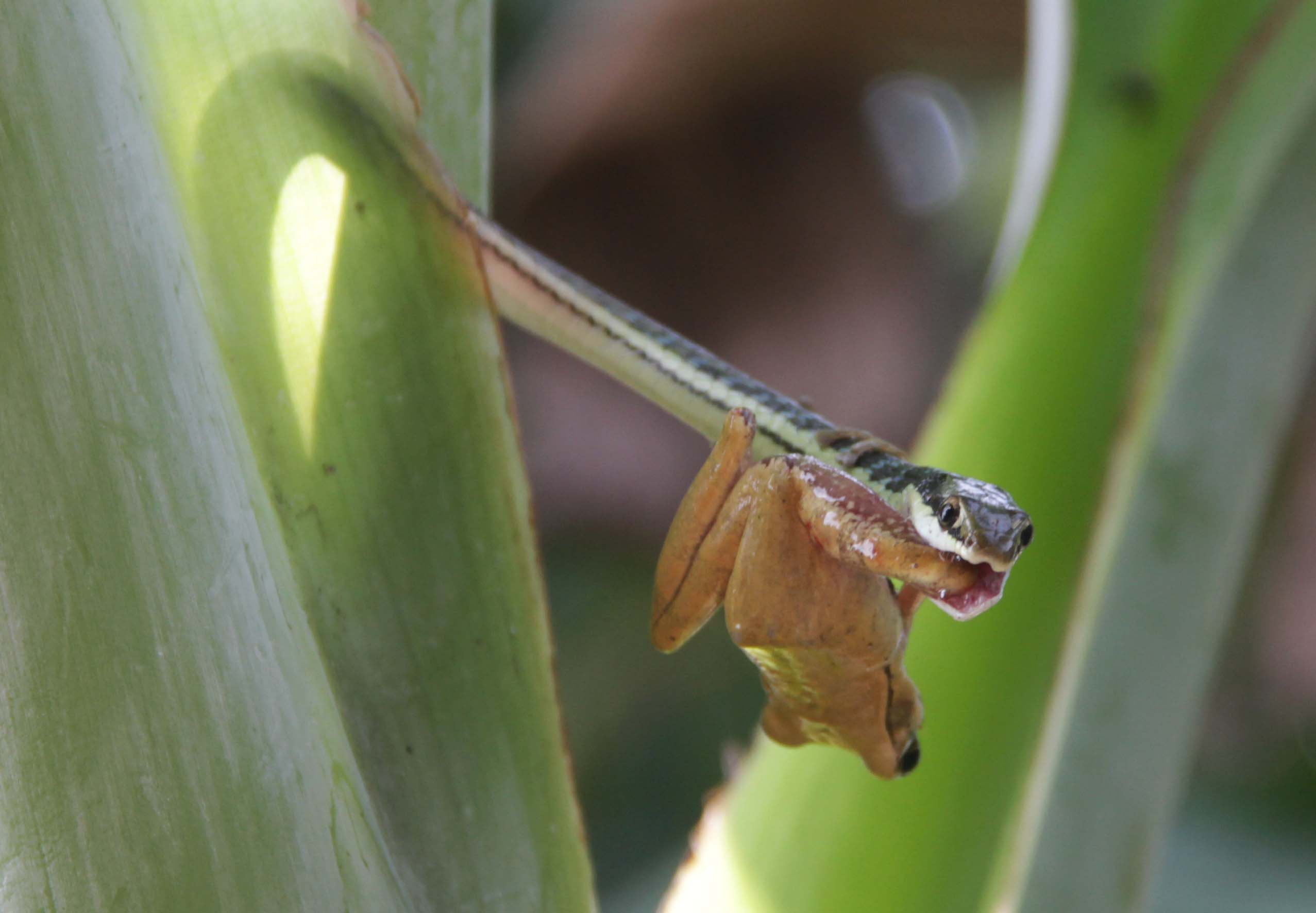 - Seekor ular berhasil menangkap seekor katak (Anura) diatas tanaman pisang cavendish (Musa acuminata Cavendish Subgroup).