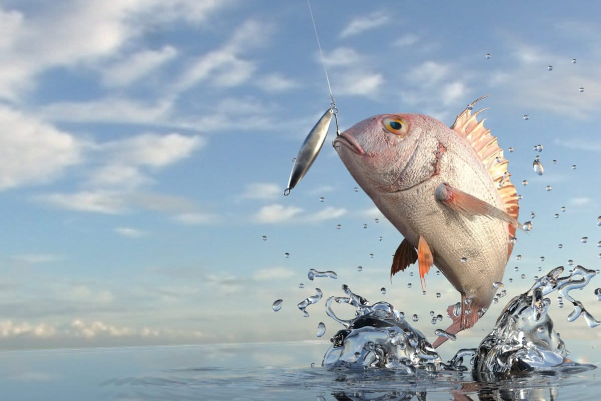 Keterangan foto utama : Seekor ikan kakap melompat dari permukaan air laut untuk memakan umpan. Foto : shutterstock