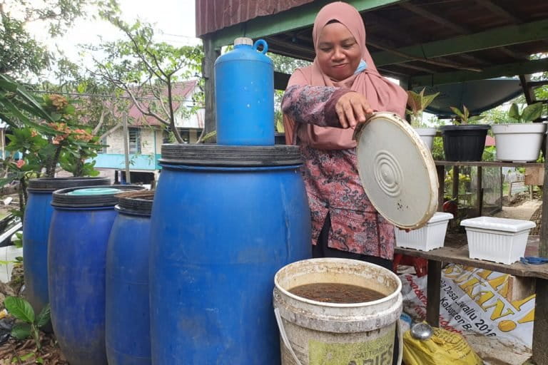 Di halaman rumahnya yang sempit terdapat beberapa drum besar berisi pupuk cair yang siap digunakan. Selain digunakan sendiri juga diberi ke petani lain, biasa digunakan untuk tumbuhan pekarangan rumah.