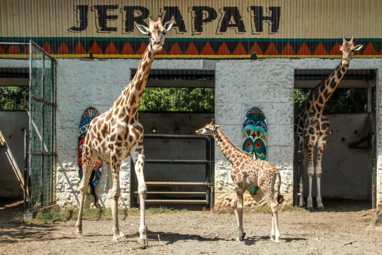 Keterangan foto utama : Kindi, anak jerapah yang lahir pada 15 Juni 2020, merupakan satwa koleksi Maharani Zoo dan Goa, Lamongan. Foto: Falahi Mubarok/Mongabay Indonesia