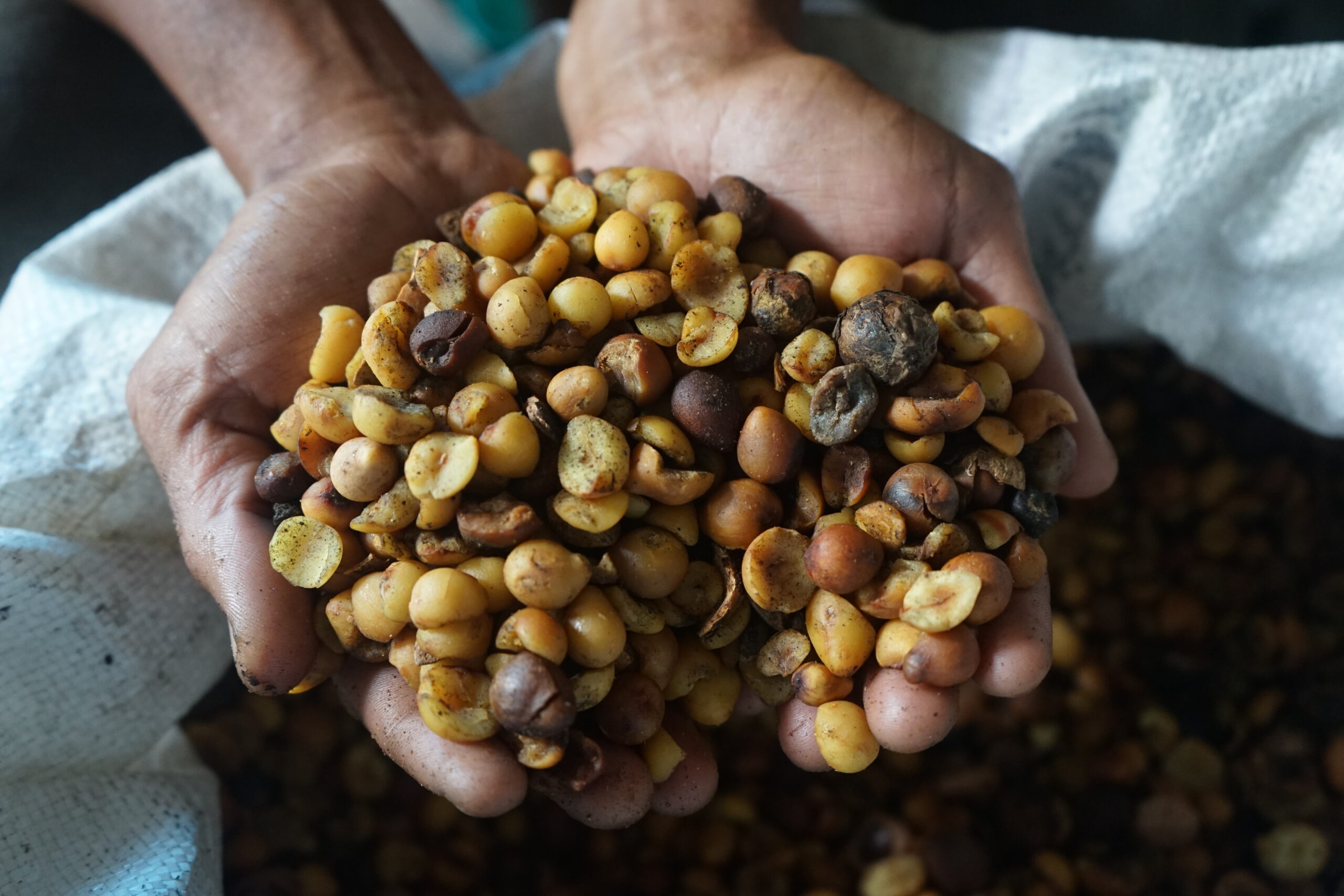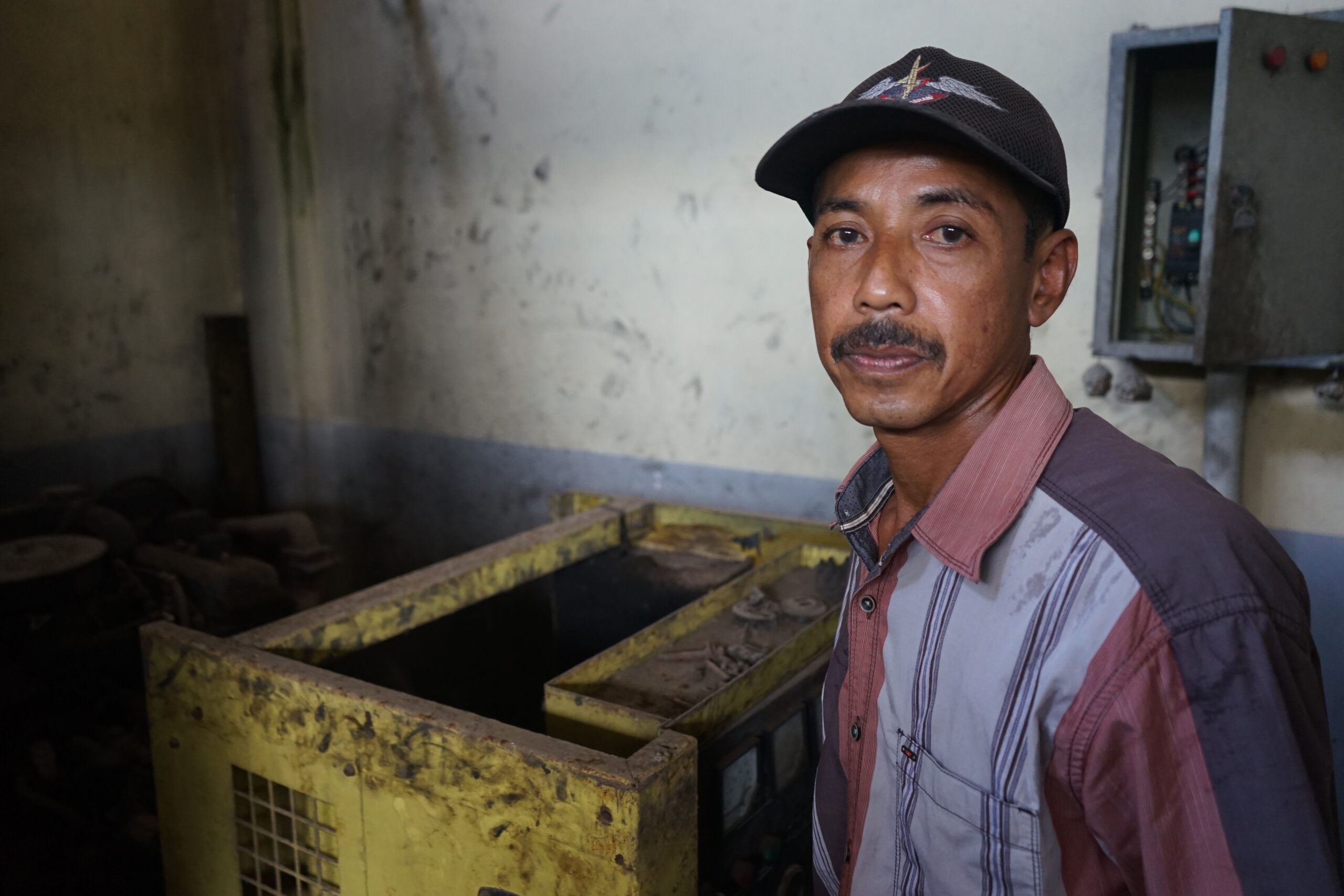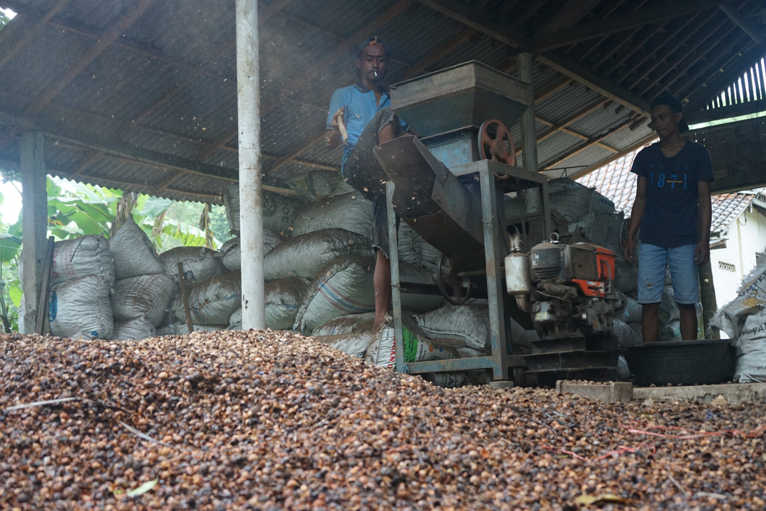 Di desa Patutrejo, suara deru mesin pemecah biji nyamplung kering memekakkan telinga, meraung-raung tanpa henti. Semburan partikel debu halus dari lubang buangan mesin, membuat mata perih. Dari kejauhan, Barino [49 tahun] mengawasi dua pekerjanya. Pagi itu, berkuintal-kuintal biji nyamplung kering dipecah dengan mesin, lalu dipilah secara manual, sampai bersih dari kulitnya. Butuh ketelatenan untuk membersihkan biji dari kulitnya.