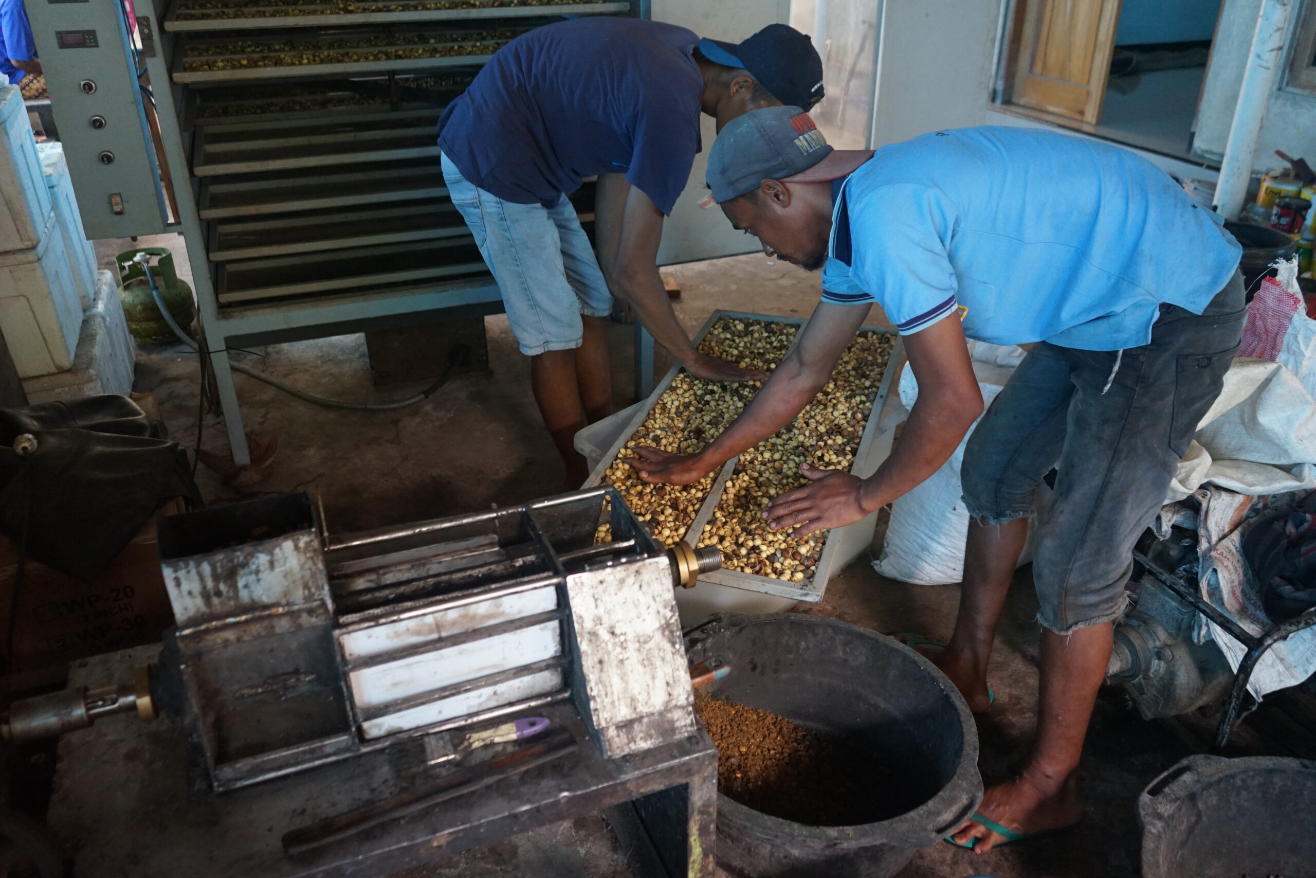 Setelah semua biji bersih, dua pekerja memasukkan ke oven berukuran besar, waktu pengeringan selama 2-3 hari. “Jika masuk musim hujan begini, nyamplung harus dikeringkan dengan oven. Karena panas matahari sedikit, “ujar Barino.