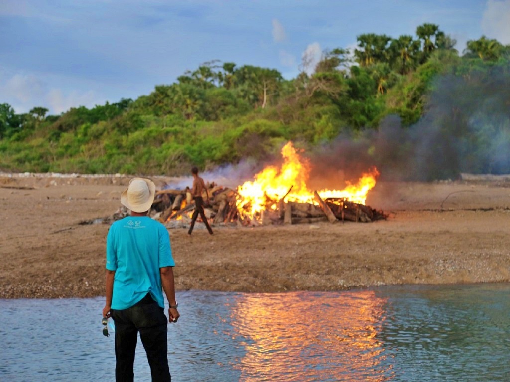 Pembakaran dilakukan bertahap, karena posisi bangkai yang berada di lokasi pasang surut sehingga proses pembakaran hanya dapat dilakukan pada saat air surut.