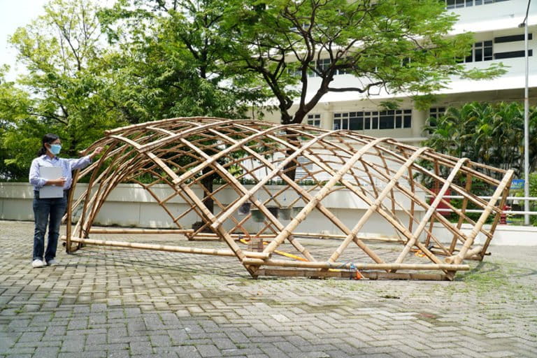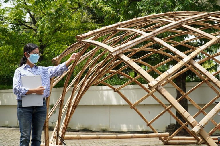 Dia pun meneliti kekuatan bambu yang dibentuk menjadi struktur gridshell. Jenisnya, bambu apus [Gigantochloa apus] dan bambu petung [Dendrocalamus asper].
