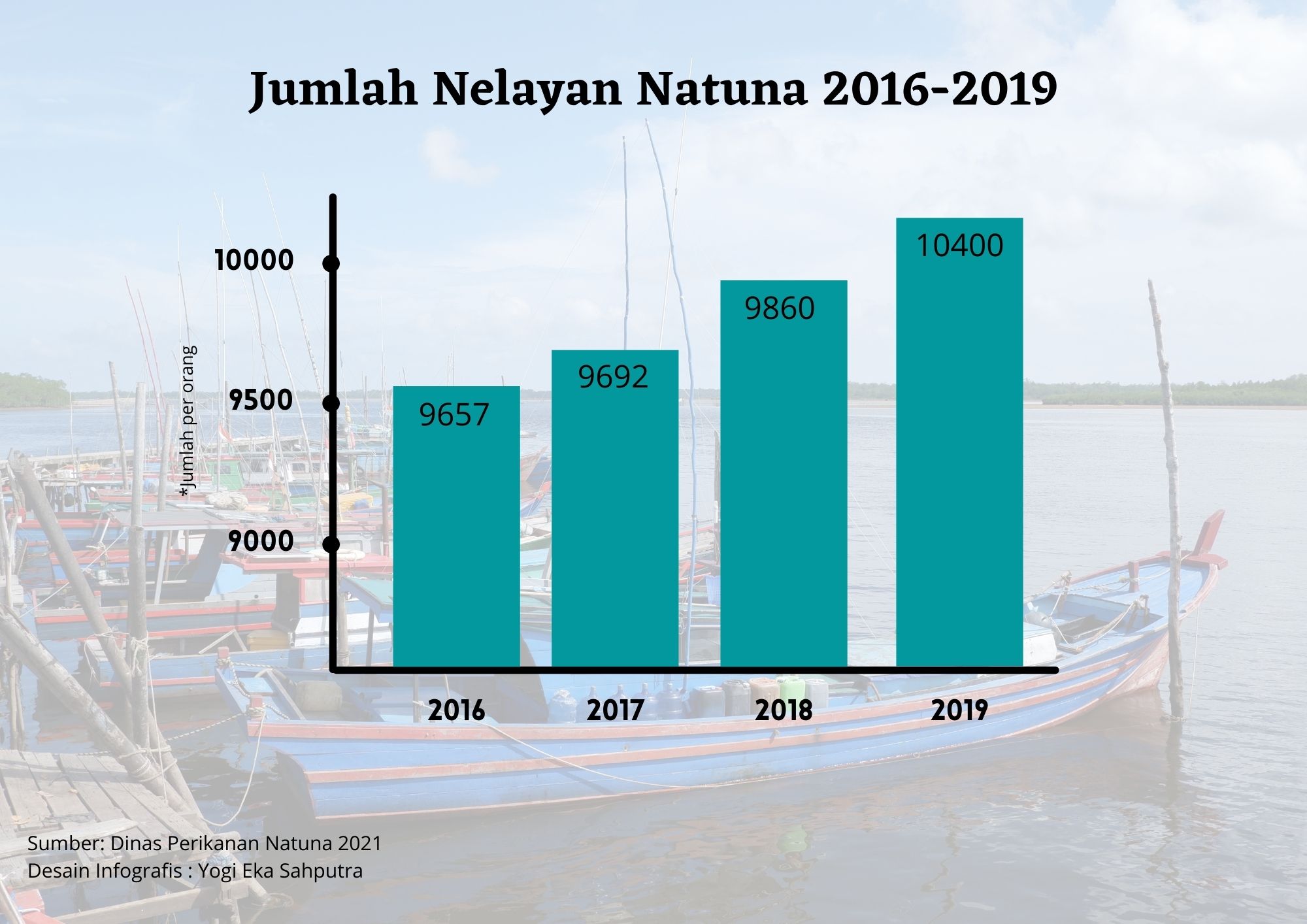 Data Dinas Perikanan Kabupaten Natuna menunjukan jumlah nelayan Natuna meningkat setiap tahunnya sejak 2016-2019. Tahun 2016 jumlah nelayan Natuna 9.657 orang, kemudian 2017 sebanyak 9.692 orang, 2018 sebanyak 9.860 orang, dan naik drastis tahun 2019 menjadi 10.400 orang.