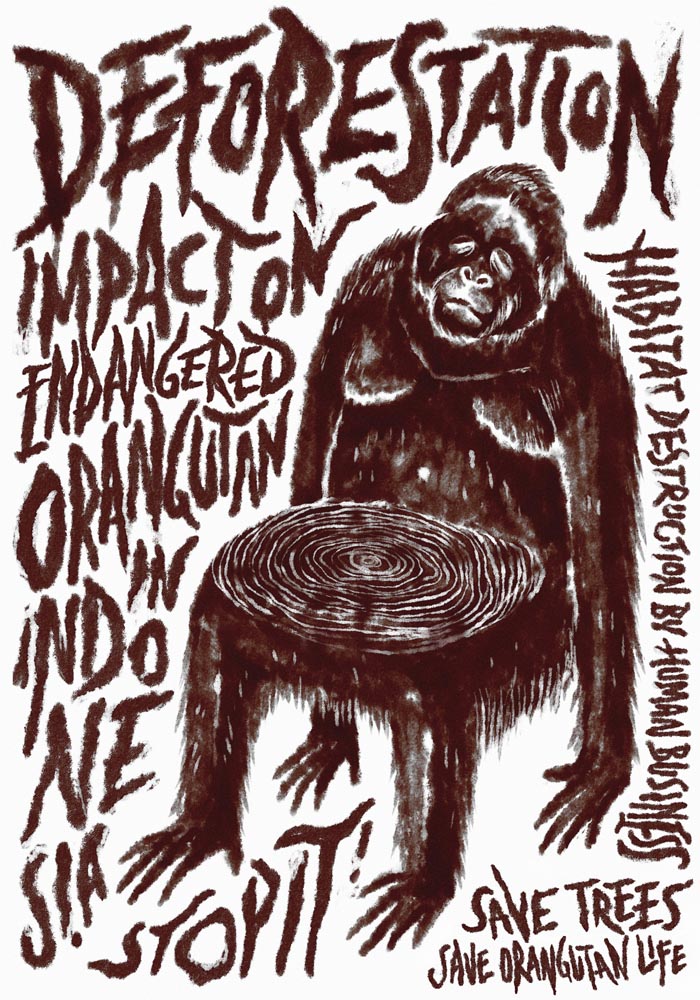Sepotong kayu tebangan ukuran sedang dengan serat daging tak beraturan. Pada bagian lain, ratusan pohon kecil tumbuh sehat. Di belakangnya, hamparan pohon terbabat tersisa pangkal. Sebagian hangus terbakar, menimbulkan asap tebal membubung. Orangutan nampak duduk dengan sepotong pepohonan di hutan berkabut, tak berdaun. Dahan dan ranting kering terlilit huruf simbol dolar berwarna hijau.