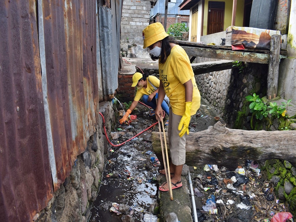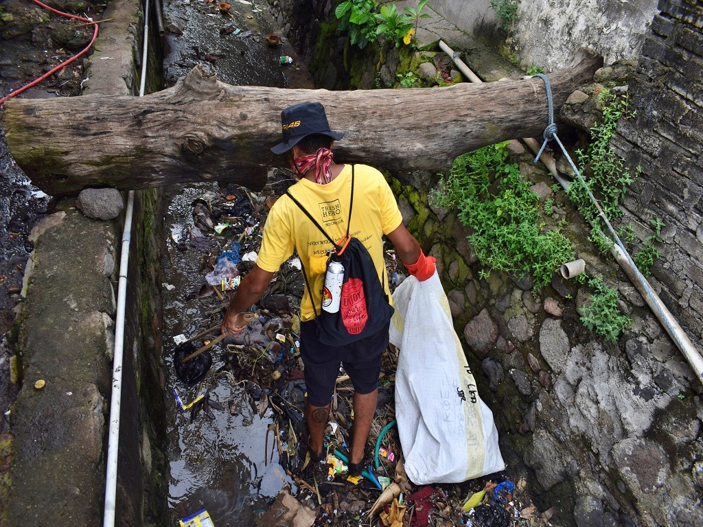 Menggunakan sarung tangan, alat penjepit sampah dan karung, mereka berjalan dari rumah ke rumah menyisiri gang-gang sempit hingga saluran air.