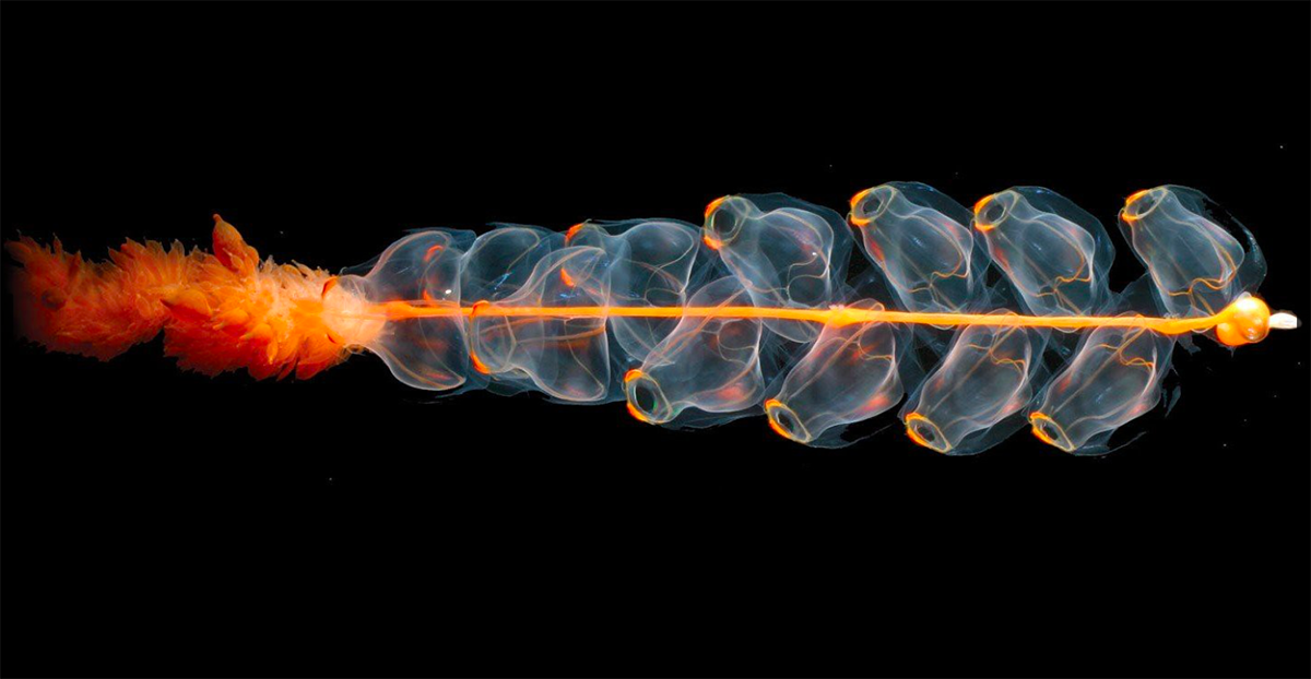 - Setiap anggota kelompok spesies ini terdiri banyak hewan kecil yang disebut zooid, terhubung satu sama lain, untuk membentuk koloni panjang seperti tali berenang dan melayang bebas di lautan.