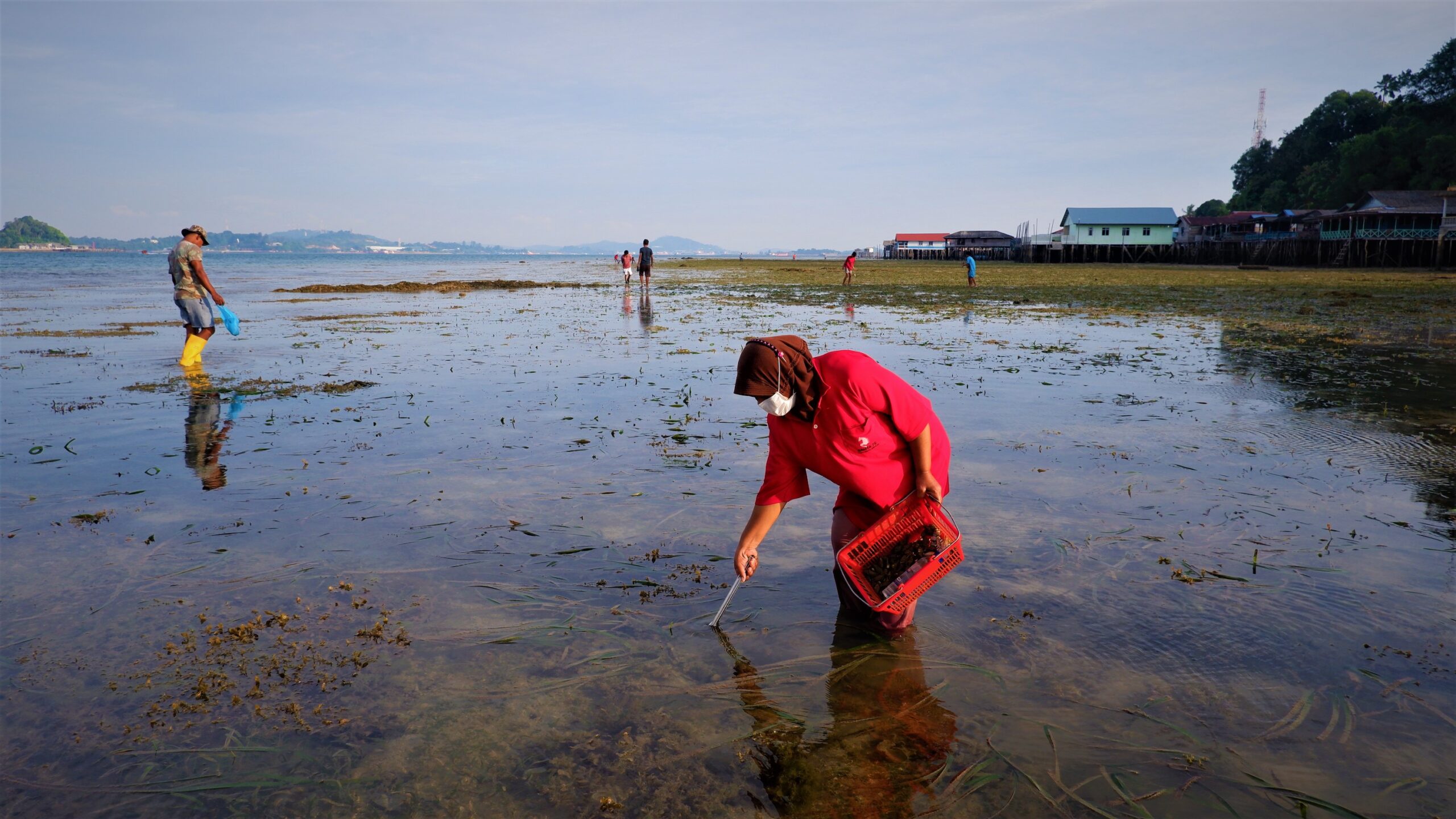 Yati yang akrab dipanggil Ros mengambil gonggong dengan alat penjepit masak dan sepatu bot plastik setinggi betis. “Pakai alat ini biar tidak digigit ikan lepu (scorpionfish), kalau digigit bisa bengkak,” katanya.