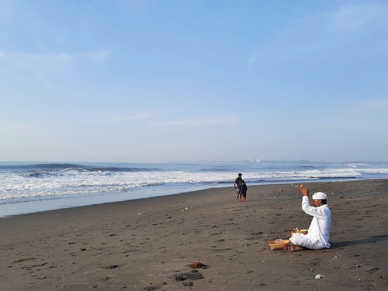 Setelah menggelar banten (sesajen) dari wadah anyaman bambu dan menghidupkan dupa, ia menenangkan diri sejenak. Setelah itu ia memanjatkan kedua telapak tangan di atas kepala untuk melakukan Panca Sembah, lima kali sembah menggunakan sarana bunga. Setelah itu, ia terlihat mencium pasir di depannya dalam posisi masih bersimpuh.