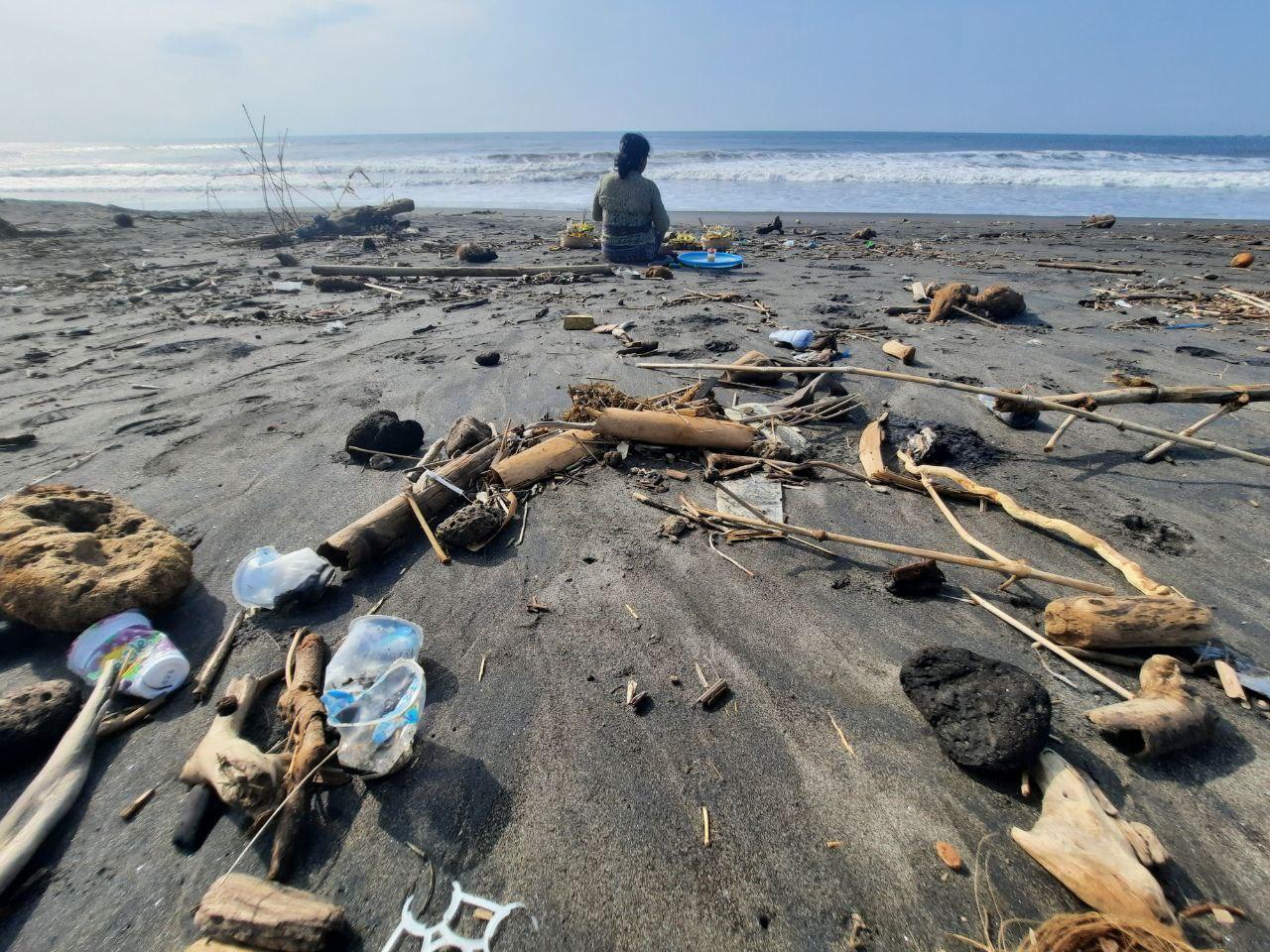 Salah satu warga yang melaksanakan ritual Melasti adalah Sari. Ia datang seorang diri ke Pantai Lembeng, Kabupaten Gianyar, dekat rumahnya. Pada Rabu (02/03/2022) pagi, ia duduk bersimpuh di atas pasir hitam. Ia duduk di antara hamparan limbah kayu dan plastik yang terdampar di pinggir pantai.