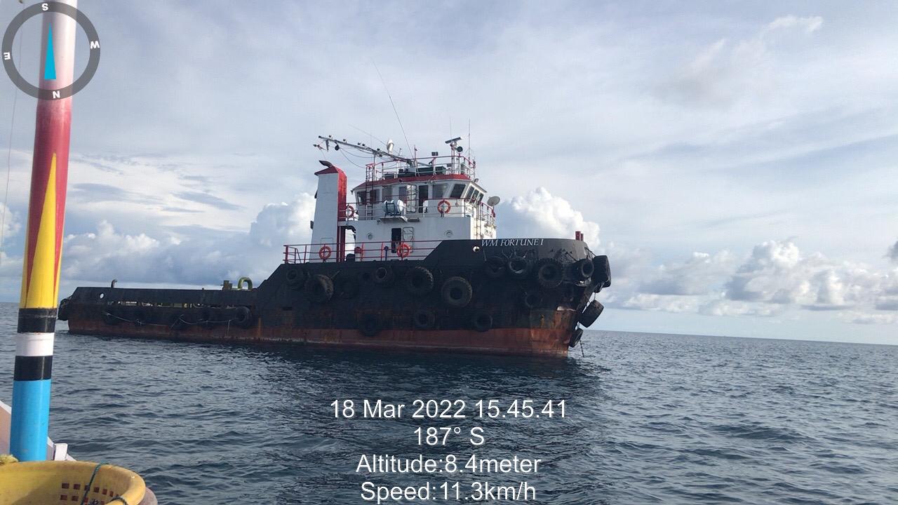 Haerul membeberkan, ada dua kapal ponton yang terdampar termasuk Woodman 37. Satu ponton lain telah memindahkan muatan batubaranya ke kapal tongkang bantuan yang baru datang. Tak jauh dari ponton itu ada dua kapal tugboat bernama lambung Dolphin dan WM Fortune I.