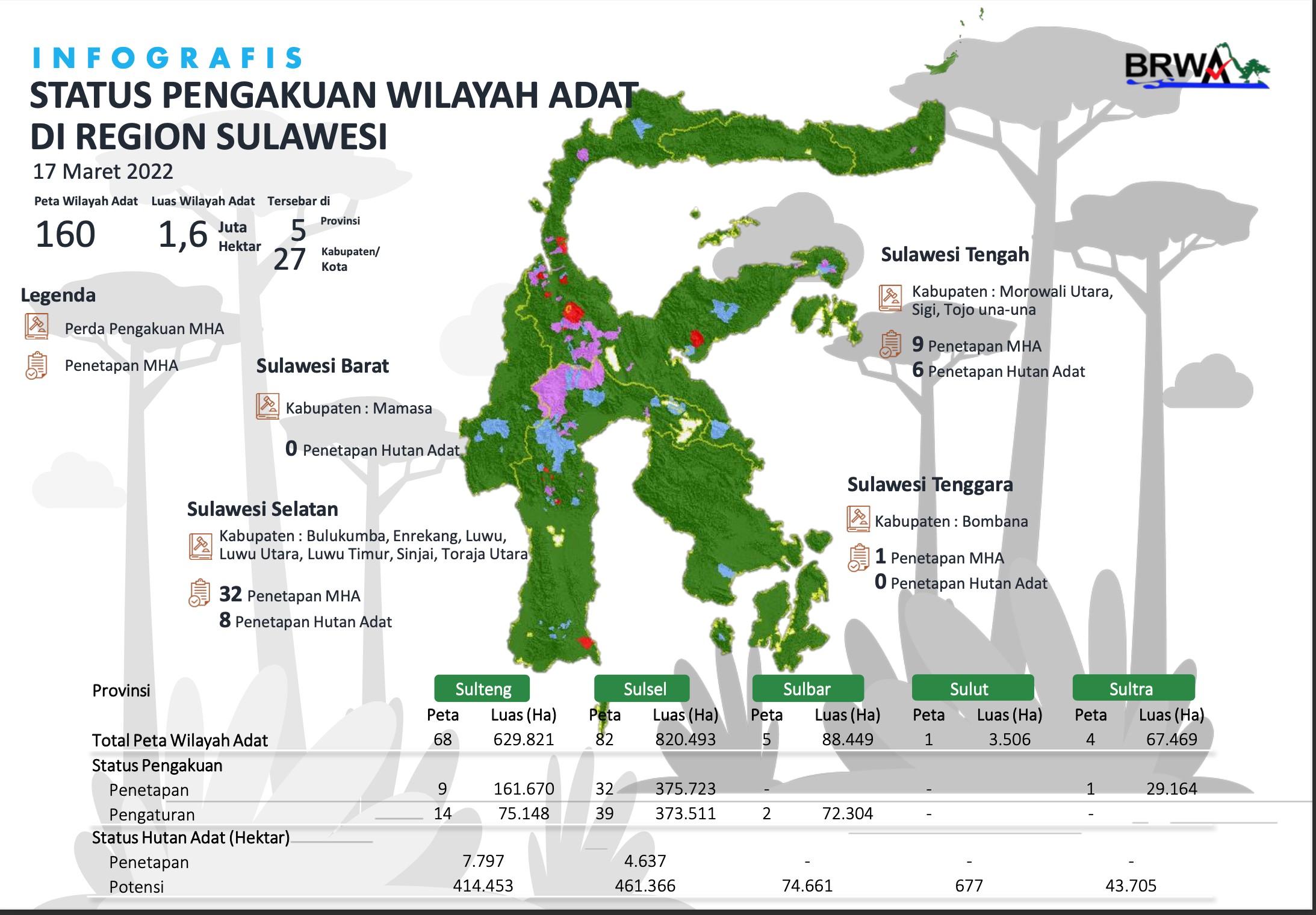 “Secara total terdapat 21 komunitas adat yang sudah mendapatkan pengakuan negara dengan luas wilayah yang diakui seluas 176 ribu hektar. Lalu, ada 8 hutan adat yang sudah ditetapkan oleh SK menteri dengan luas hutan sekitar 4.636,08 hektar. Hutan adat itu ada di Kajang dan Enrekang.”