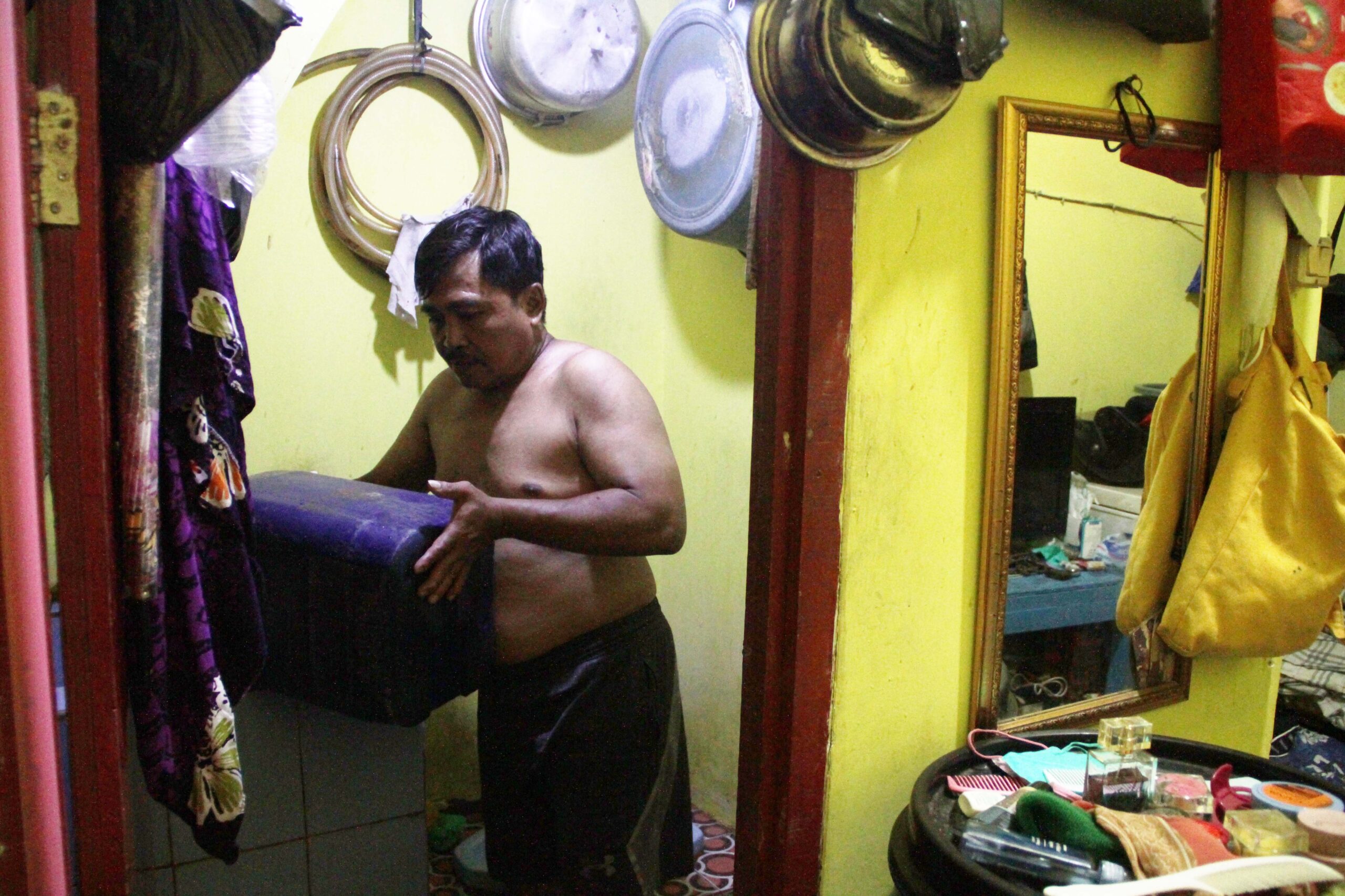“Gara-gara pengen air bersih sampai nggak ada waktu untuk bekerja, otomatis pendapatan ya menurun,” kata pria bertubuh gemuk ini usai menuangkan air dari jerigen ke dalam bak kamar mandi. Untuk memenuhi kebutuhan sehari-hari Nashir sendiri bekerja sebagai pedagang ikan di Tempat Pelelangan Ikan (TPI) Muara Angke, jaraknya terpaut 200 meter dari rumahnya.