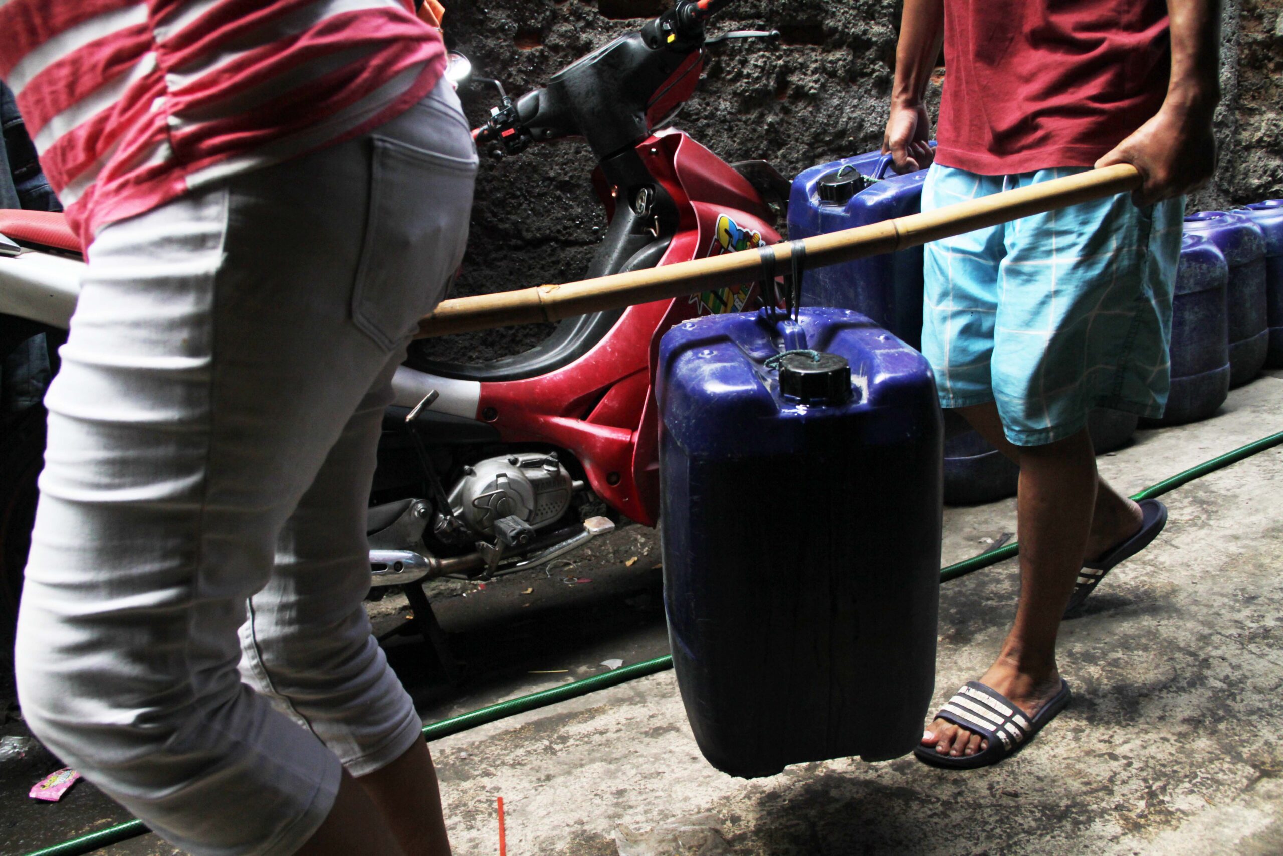 Untuk memenuhi kebutuhan air bersih di kampung tersebut, PT PAM Lyonnaise Jaya (Palyja) menyuplai dengan menggunakan truk tangki. Air itu didrop ke dalam tong-tong drum terlebih dulu sebelum diangkut warga ke rumahnya masing-masing.