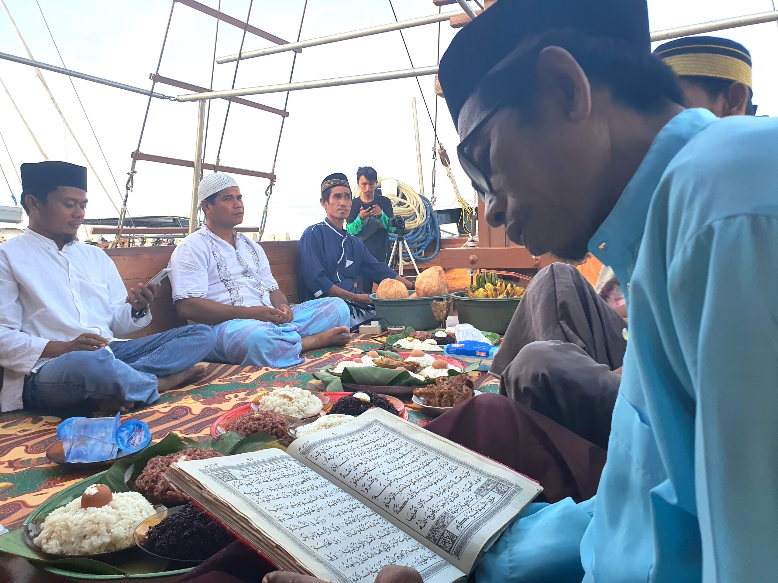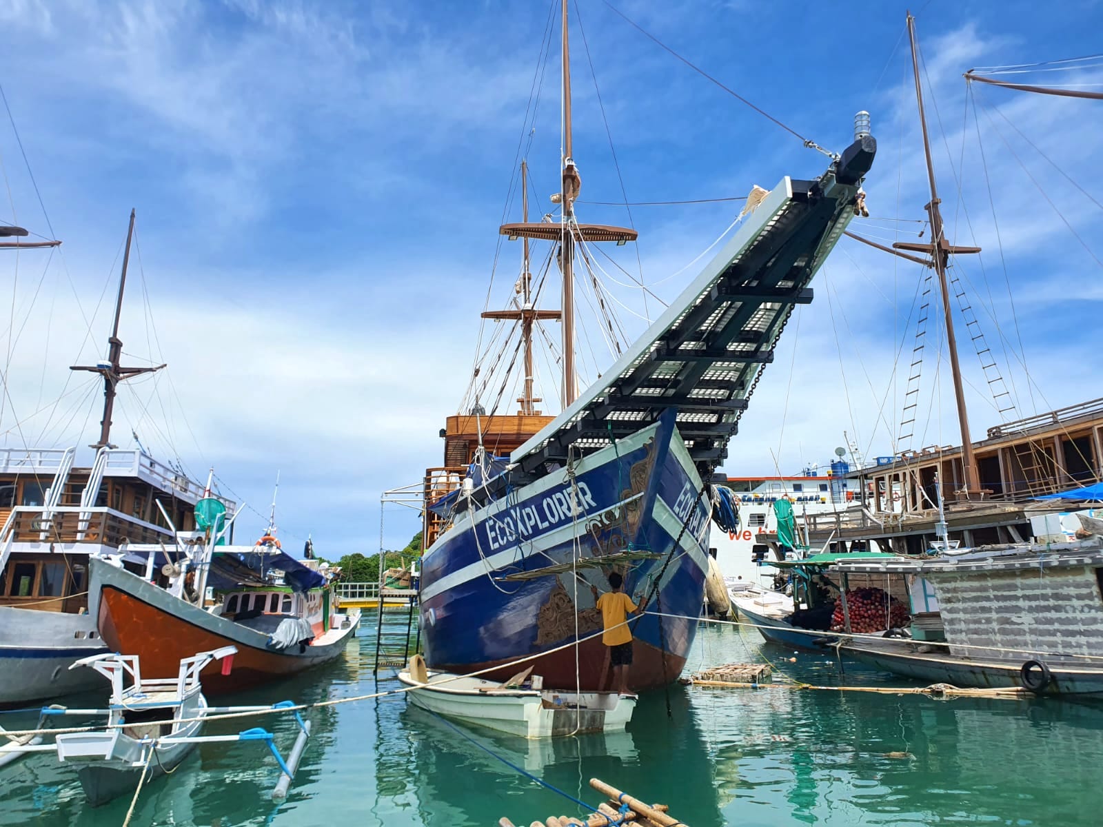 Menggunakan sebuah sampan kecil kami menuju kapal yang hanya berjarak sekitar 30 meter dari dermaga. Sejumlah tukang terlihat sibuk merapikan aksesori kapal, ada pula yang sedang mengukir bagian depan kapal sehingga terlihat lebih artistik.